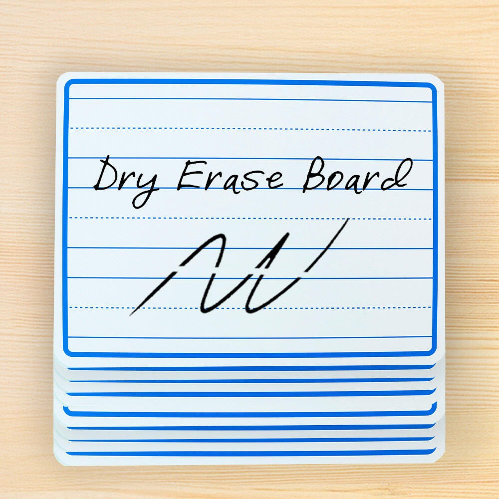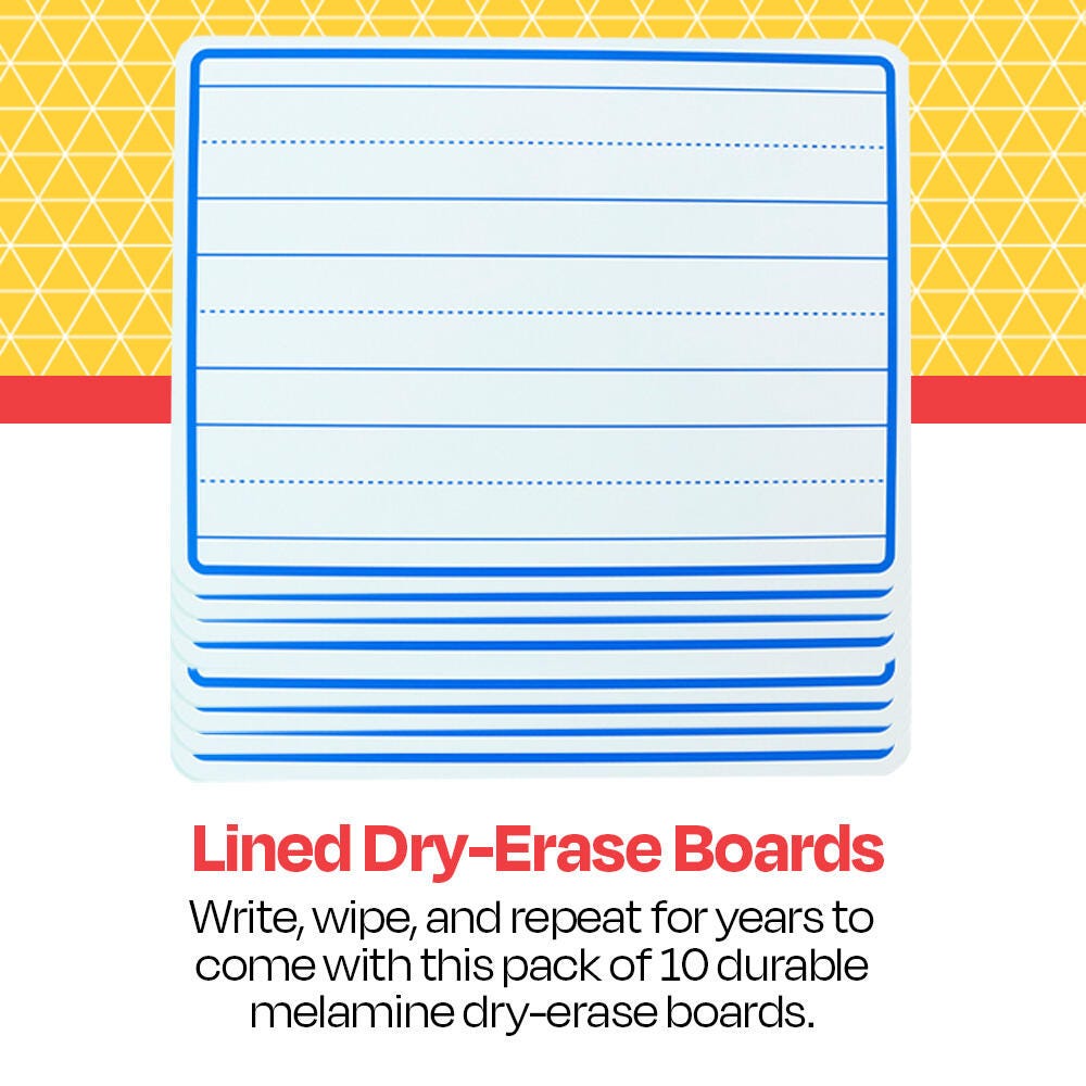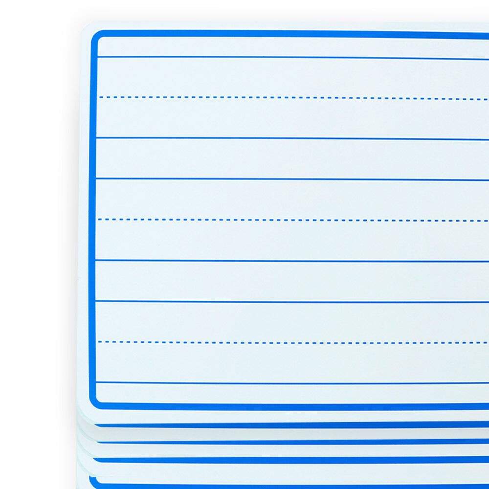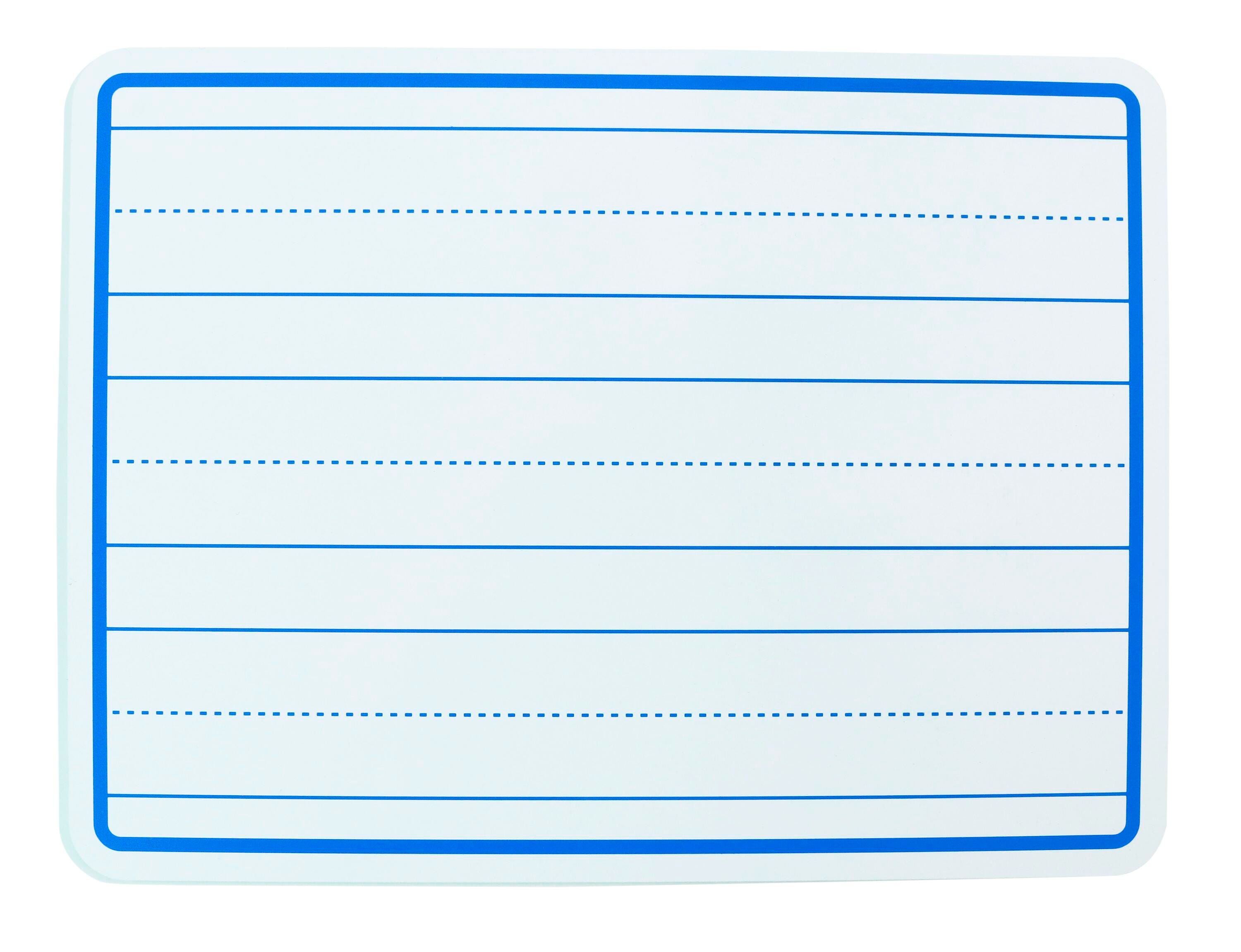 This pack of School Smart double-sided lined student dry-erase boards provides an excellent learning tool for any classroom. The boards are ruled like handwriting paper on the front side, with three lines in each set and a dotted middle line, great for early learners practicing their writing skills. The reverse side is unruled for freeform drawing, problem-solving, or brainstorming. These versatile write-on/wipe-off boards are lightweight, easy to clean, and ideal for interactive learning! The boards measure 9 x 12 Inches.