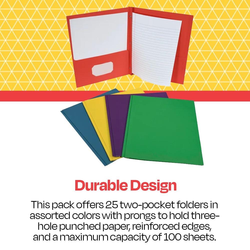 25 Assorted Color Folders, Twin Pockets with Fasteners