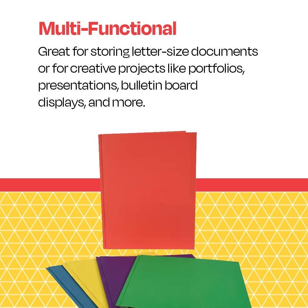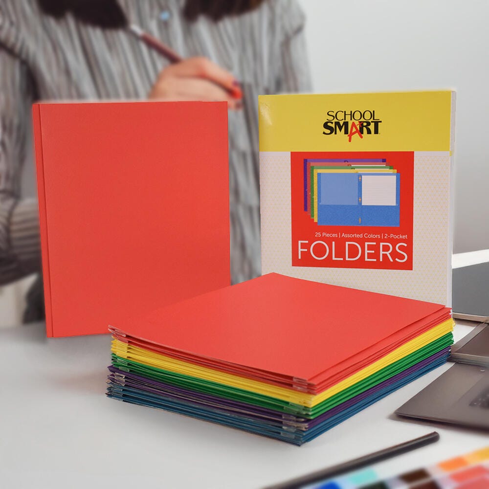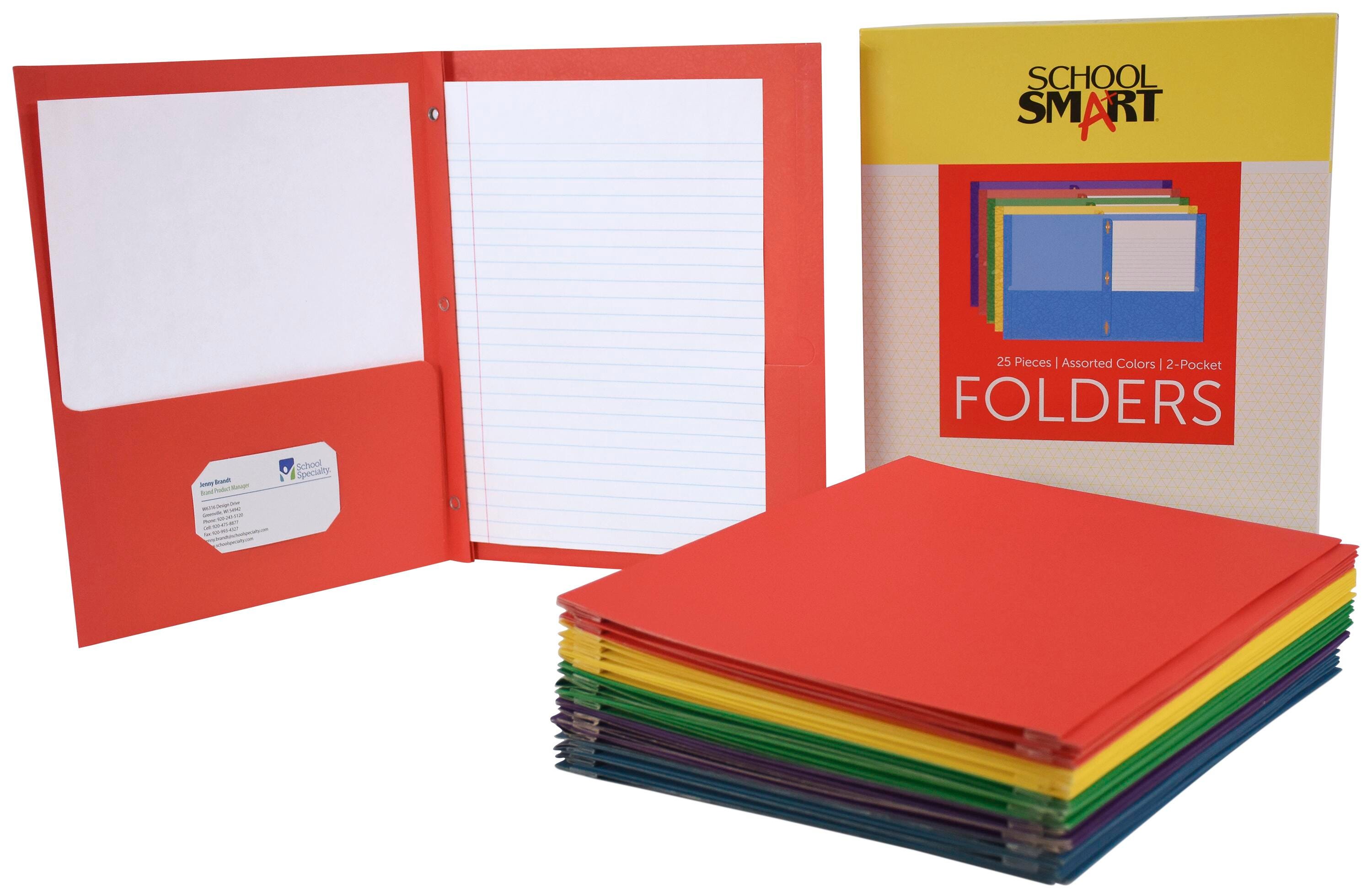 This set of School Smart 2-pocket folders with fasteners comes in assorted colors. Each twin pocket file portfolio holds 8-1/2 x 11 inch sheets. An expandable gusset insert with three fasteners fits standard 3-hole punched sheets for extra storage. The pocket folder with prongs can be used for daily storage, protection for important documents, or as a report cover for school. An embossed finish with double reinforced edges provides extra durability.