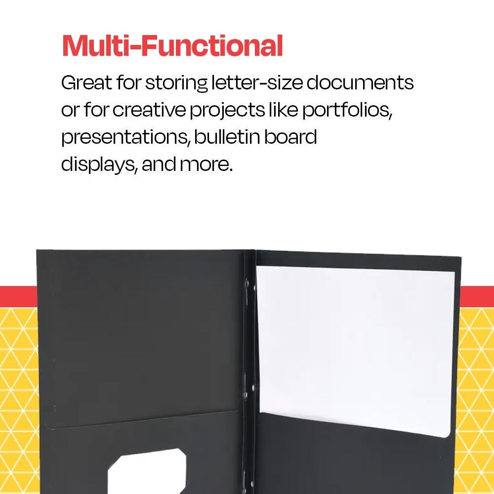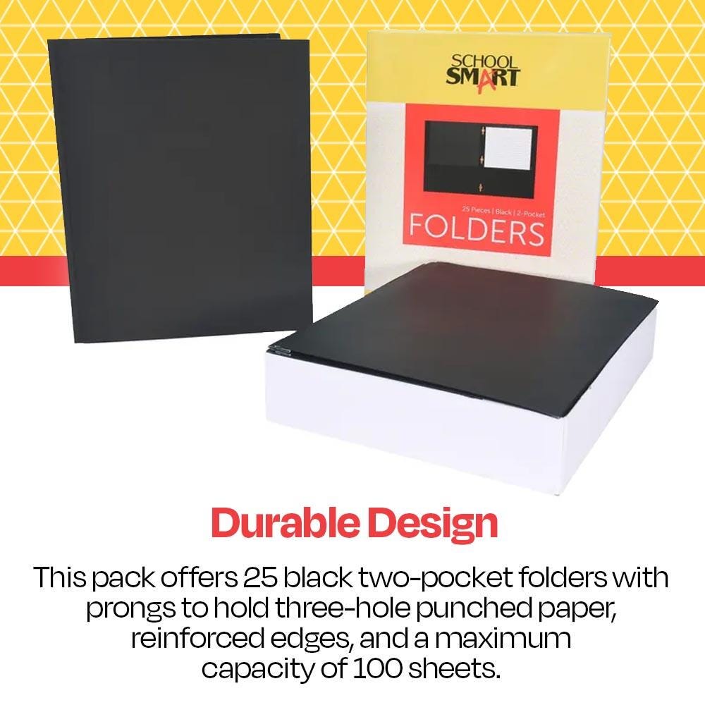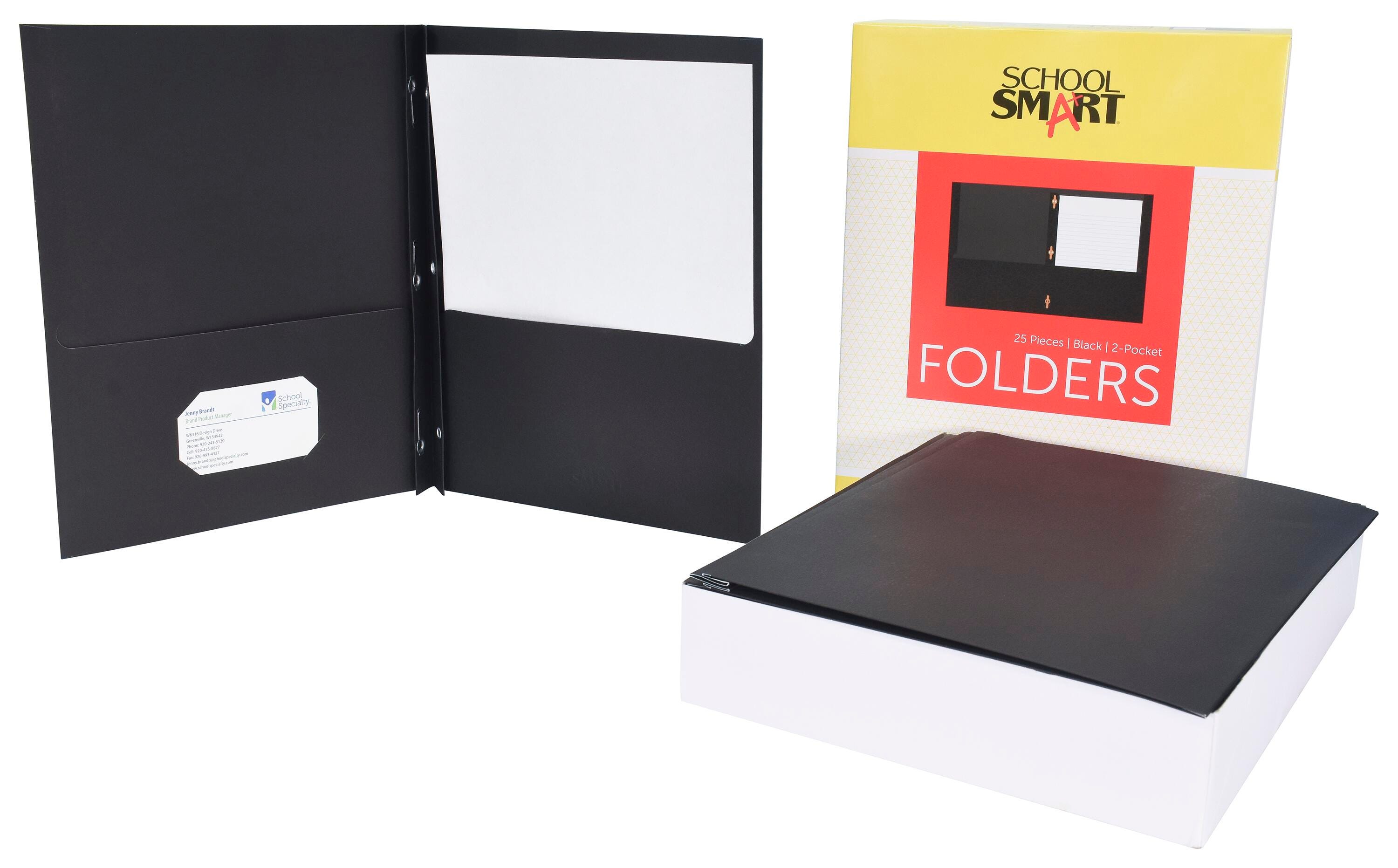 This set of School Smart 2-pocket folders with fasteners comes in a classic black color. Each twin pocket file portfolio holds 8-1/2 x 11 inch sheets. An expandable gusset insert with three fasteners fits standard 3-hole punched sheets for extra storage. The pocket folder with prongs can be used for daily storage, protection for important documents, or as a report cover for school. An embossed finish with double reinforced edges provides extra durability.