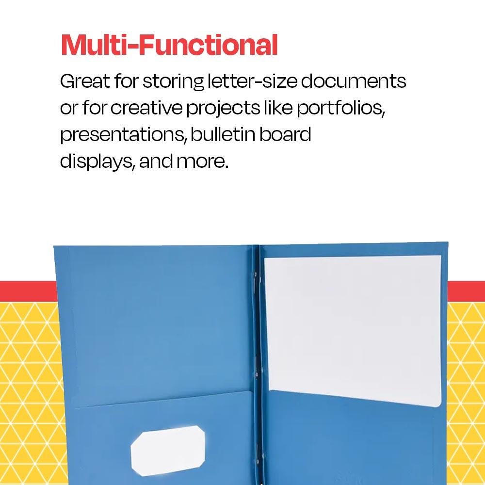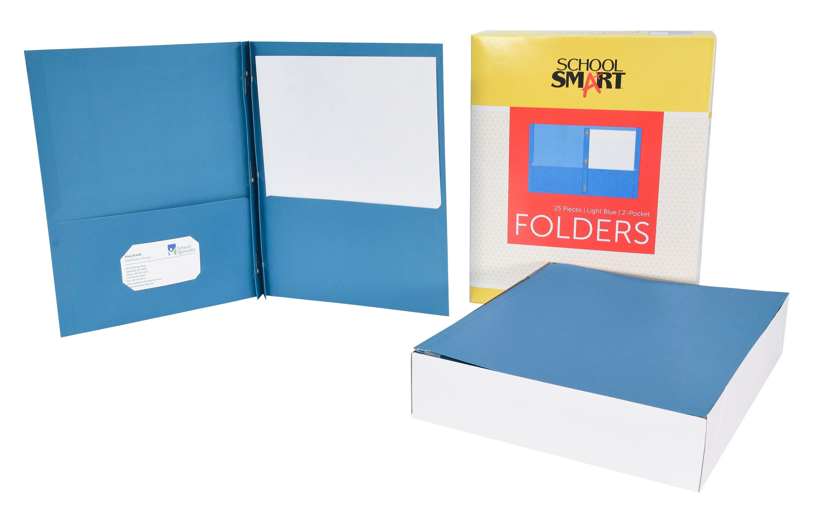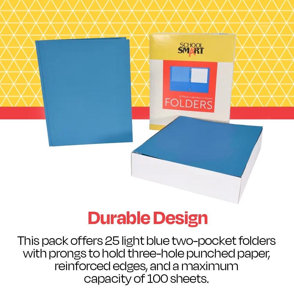 This set of School Smart 2-pocket folders with fasteners comes in a classic light blue color. Each twin pocket file portfolio holds 8-1/2 x 11 inch sheets. An expandable gusset insert with three fasteners fits standard 3-hole punched sheets for extra storage. The pocket folder with prongs can be used for daily storage, protection for important documents, or as a report cover for school. An embossed finish with double reinforced edges provides extra durability.