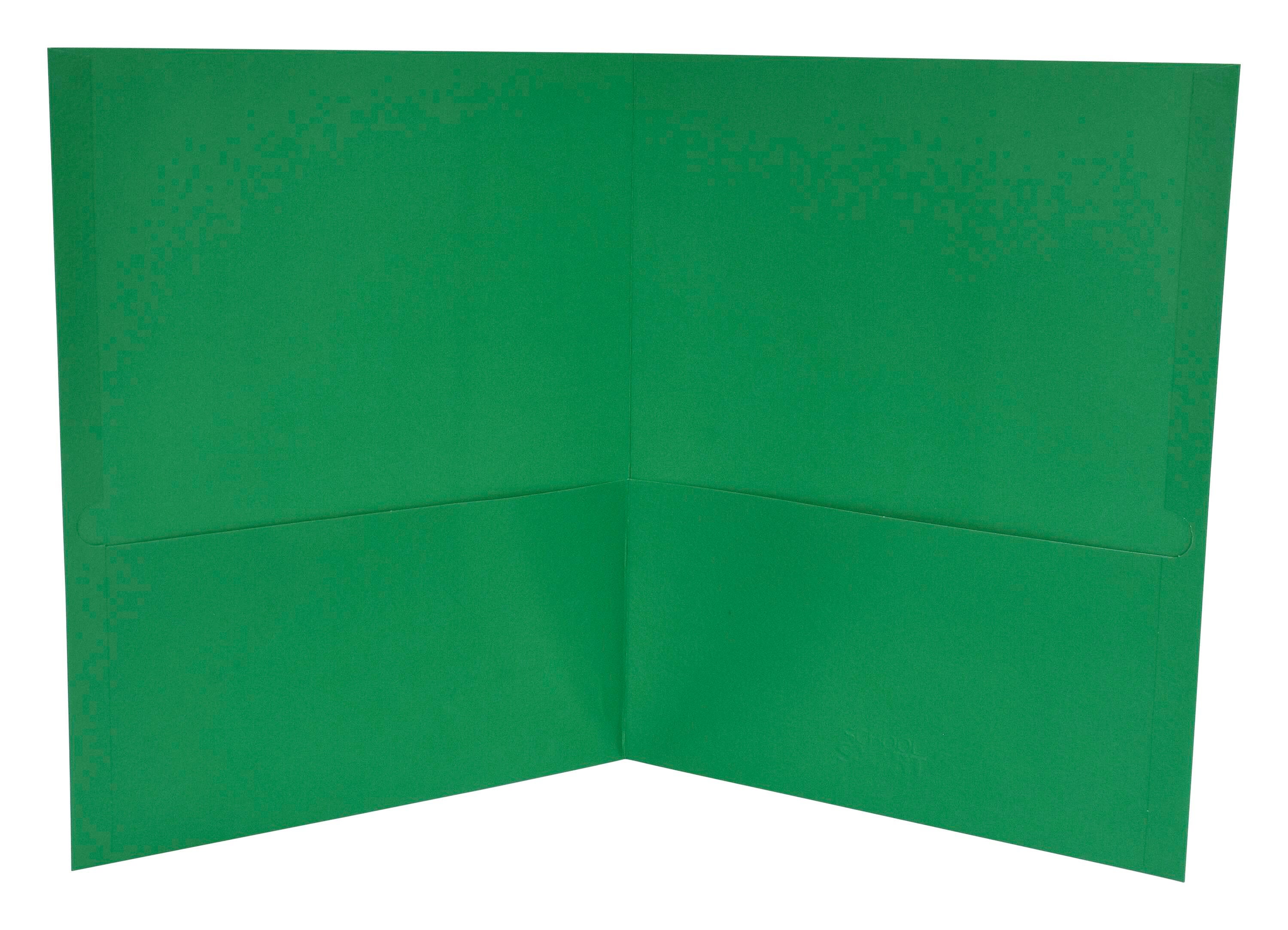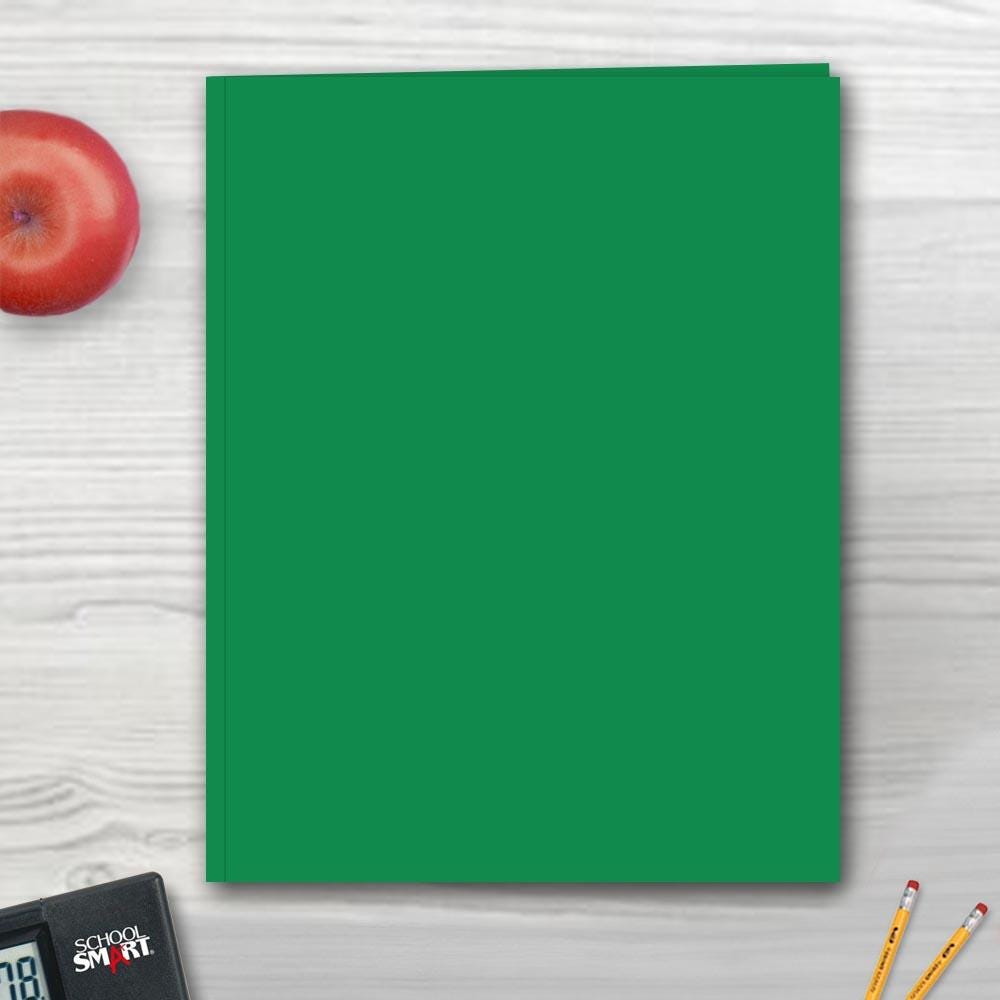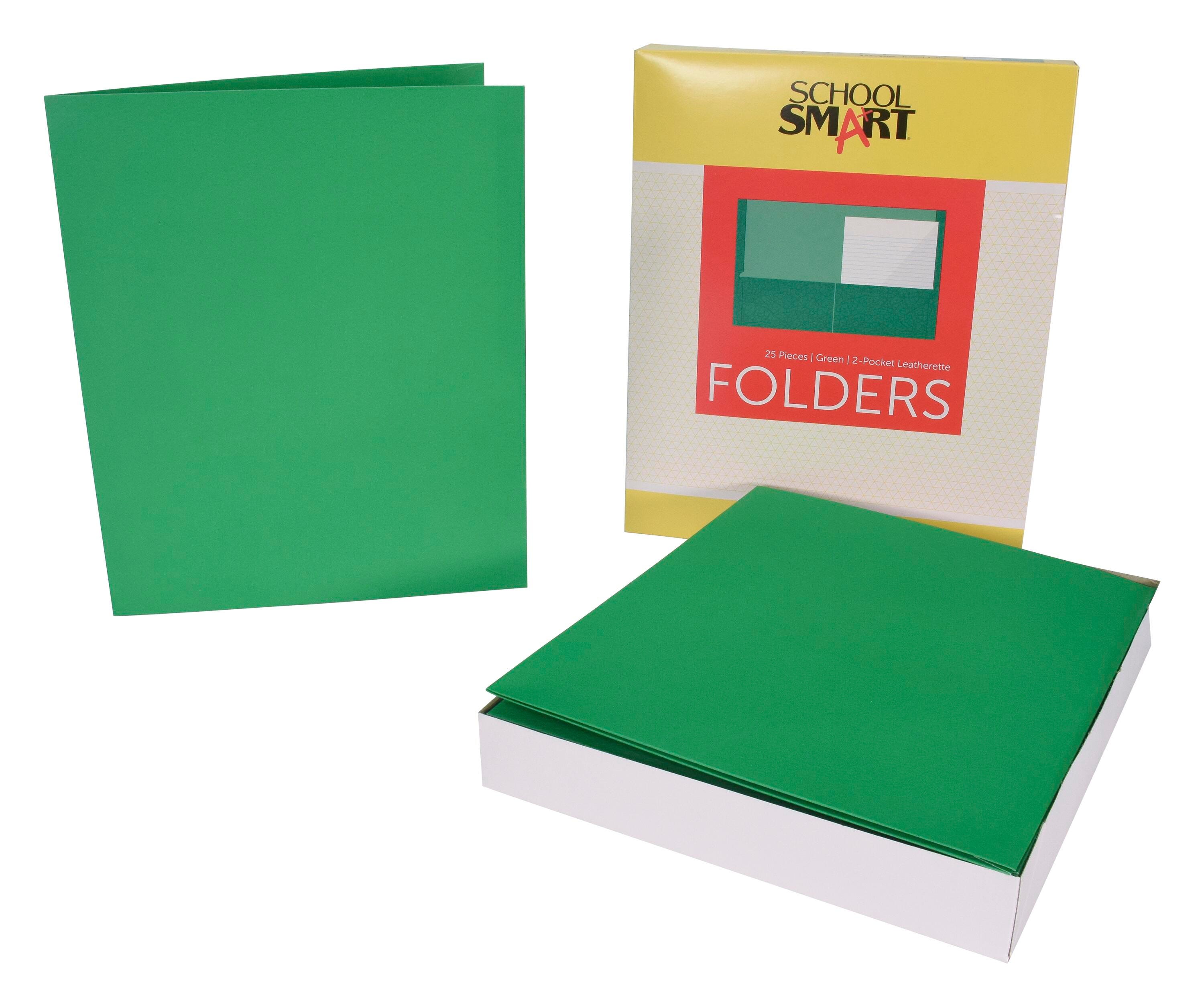 Organize your classroom, office, or home with the School Smart 2-pocket folders 25 pack. Our durable two pocket folders hold up to 100 sheets and come in a green color. Use these blank 2-pocket folders for report covers, business presentations, or traditional storage for important documents. An embossed leatherette texture lends quality for both professional, school, and personal needs. The double pockets are closed on three sides (outer edge, top, and bottom) to ensure your papers stay securely in place, while double-reinforced edges provide extra durability when opening and closing.