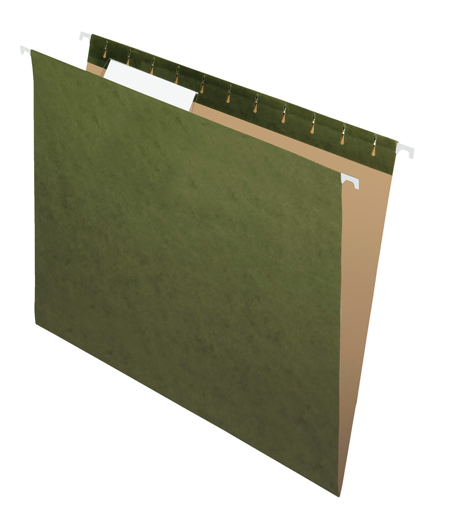 These School Smart green hanging file folders come in a letter size with 3 clear top tabs for labeling. The filing folders are made of smooth, medium weight stock for long-lasting use in the classroom or office. Our sturdy design helps store important paperwork in a vertical file, while two tones help you identify files quickly and easily. Each reinforced hanging folder has coated hangers for smooth sliding in file cabinets, desk drawers, and storage boxes. Create custom labels with blank inserts and 1/3 cut clear tabs to create your best organization system for letter sized papers.