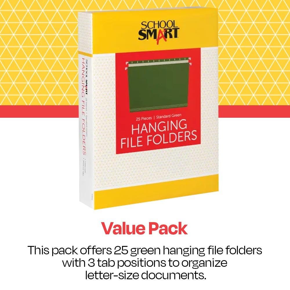 School Smart Hanging File Folders, Letter Size, 1/3 Cut Tabs, Green, Pack of 25