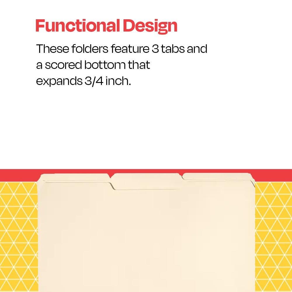 School Smart manila file folders come in a legal size for your professional or personal filing needs. The legal size folders measure 9-1/2 x 14-3/4 inches each and are made of smooth finish, medium weight manila. These filing folders come with 3 tabs for easy labeling and sorting.