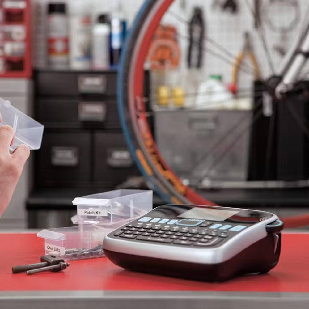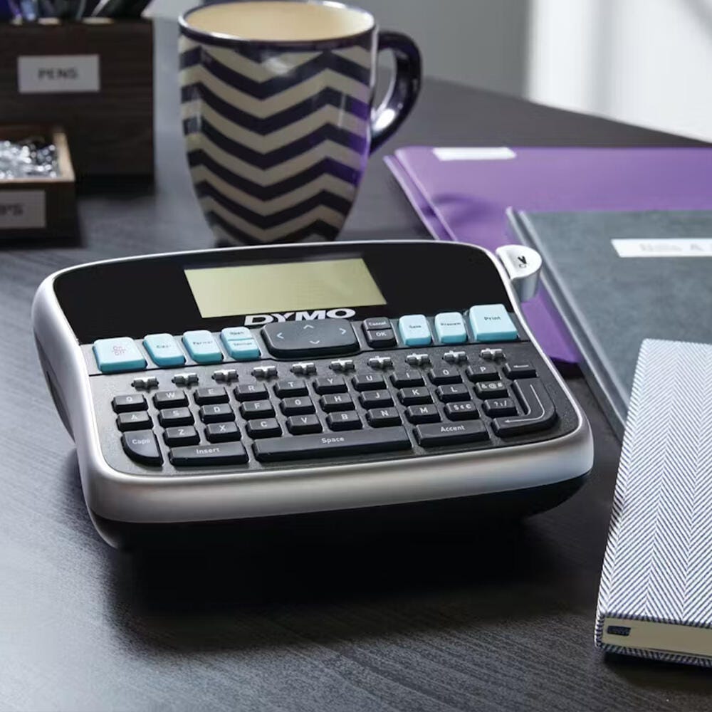 Labelmaker offers a large 1-1/2 inch x 2-3/4 inch screen with two lines of label text. Graphical display lets you see text effects on screen before you print. Print up to 10 copies of the same label. User interface displays all menu items without scrolling and includes intuitive icons for formatting options. Familiar QWERTY keyboard speeds text entry. Label printer offers a nine-label memory, save-text feature and quick access to special symbols including punctuation and currency. Customize labels and add emphasis by choosing from three font styles, seven font sizes, one of the many styles, and one of eight different box styles or underline. Label printer uses Dymo D1 labels in 1/4 inch , 3/8 inch , 1/2 inch and 3/4 inch widths. Compact, lightweight design is perfect for any office or work space. Label maker is powered by a rechargeable lithium-ion battery and includes a lithium-ion battery, charging cord, starter label cassette and manual.