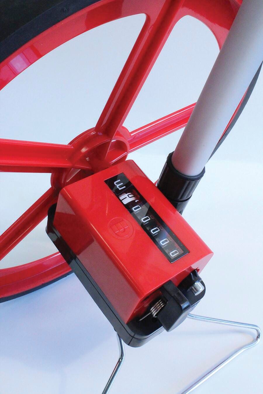 Frey Scientific 12-1/4 inch Diameter Deluxe Trundle Wheel featuring heavy-duty construction features a metered counter that measures up to 99999 m. Students can hear a 'click' with every meter measured and then compare their tally to the counter's reading. It is featured with a telescoping handle for comfort, a foldable built in stand, rubber wheel trim for accuracy. Easy to roll wheel offers a convenient carrying and comes with a storage case. It is perfect for long distance measurements.