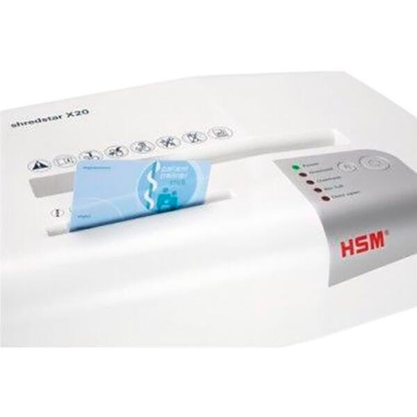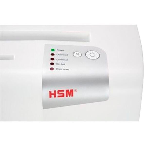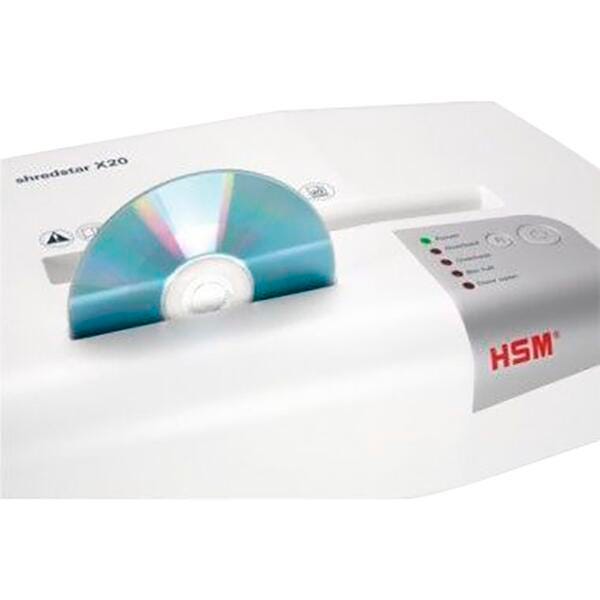 Powers through 20 sheets of paper, creating 407 cross-cut/confetti-cut particles per page. Also shreds staples, paper clips, credit/store cards, and CDs/DVDs. Lifetime warranty on cutting cylinder. Anti-Jam Technology prevents jams when machine is overloaded. Separate CD cutting unit with own waste container for sorted disposal. Quiet Operation - minimizes noise development in the workplace. LED indicator shows the device's operating status: Power, Overload, Overheat, Bin full, Door open. Light barrier for automatic start/stop. Level indicator through inspection window in the waste container. Castors for mobility and shared use. Removable 6.9-gallon bin for easy disposal. Uses an 11 gallon capacity shred bag (Part #HSM1310) as an additional option.