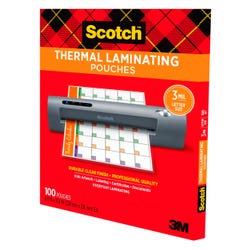 These Letter-Size Scotch Thermal Laminating Pouches are a must-have for protecting important or frequently used documents. The laminating pouches measure approximately 9 x 11-1/2 inches and are designed to protect standard letter-size, 8-1/2 x 11-inch documents. A clear design offers excellent visibility of the laminated materials, while the 3 mil thickness adds durable protection. This pack contains 100 thermal laminating pouches.Features