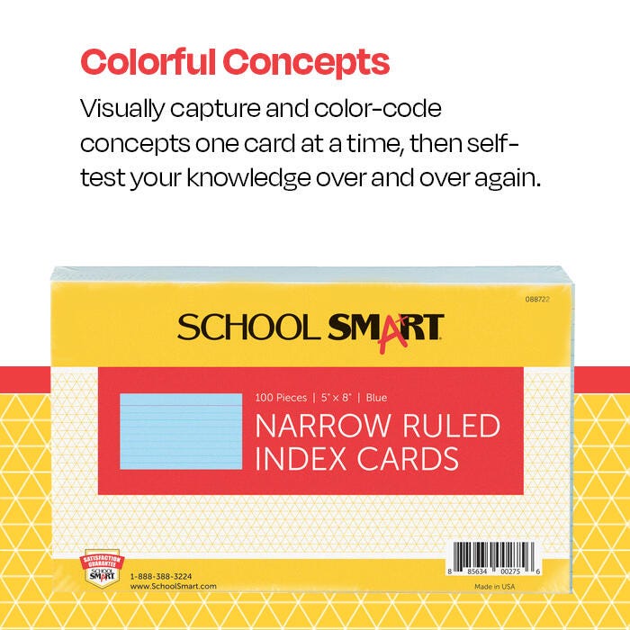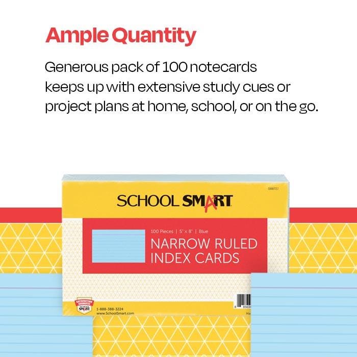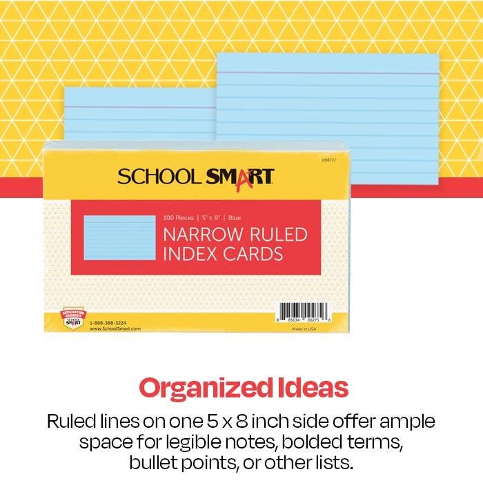 Whether you're giving the presentation of the year or you're shifting your study mode into high gear, School Smart has the tools you need to succeed. School Smart Ruled Index Cards made from 91 lb. index stock are ideal for creating flashcards that help aid in memorization and the absorption of knowledge. The cards measure 5 x 8 inches, remaining portable while also maintaining ample space for all of your key notes. Sold as a pack of 100 index cards.