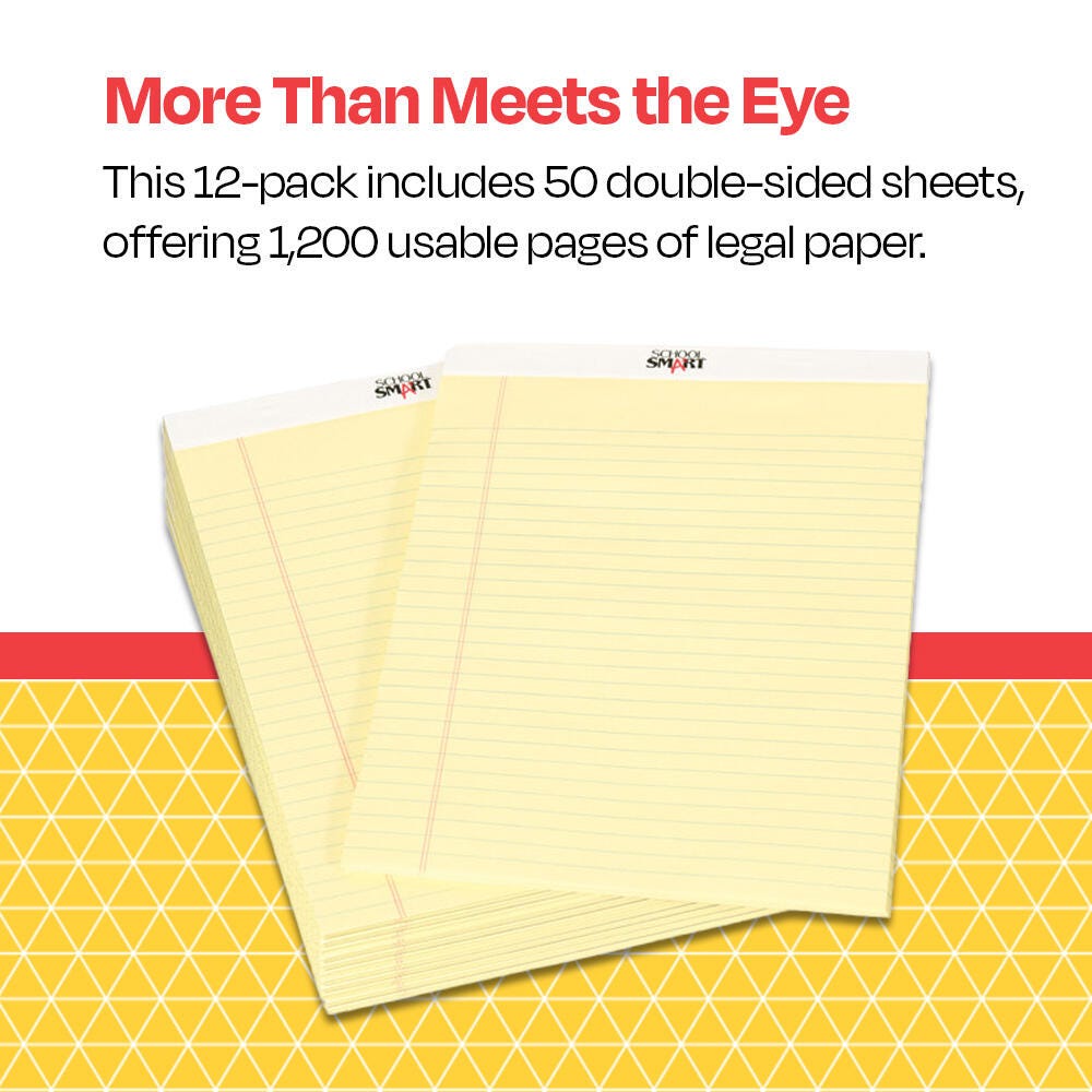 Preparation is key with a Pack of 12 Legal Pads from School Smart! Each pad contains 50 sheets of paper and measures 8-1/2 x 14 inches. The sheets are perforated and stapled at the top with print on the head strip making them easy to remove and share notes or simply file away. Pages are 3/8 inch ruled on both sides with red margins. The sturdy chipboard back allows for ease of use on the go and keeps your notes from bending during transport. Pack of 12 ruled legal pads.