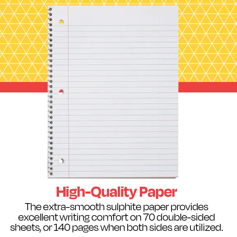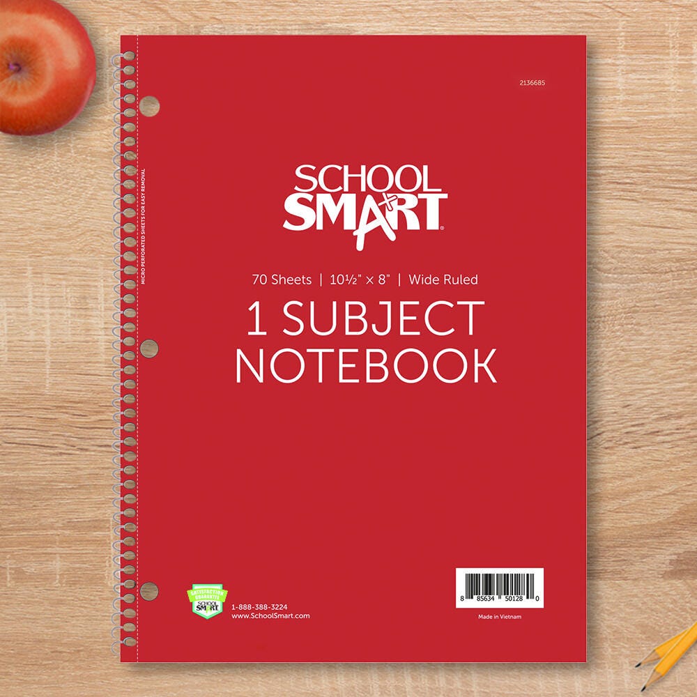 School Smart delivers quality writing supplies for students in the classroom and at home. This spiral-bound notebook has 70 sheets of bright white paper. Each page features ruled margins and 3/8-inch wide ruled lines that provide more space for larger handwriting, perfect for young students who are learning to write. The notebook features pages that are conveniently perforated for easy tear-out and a bold red cover.
