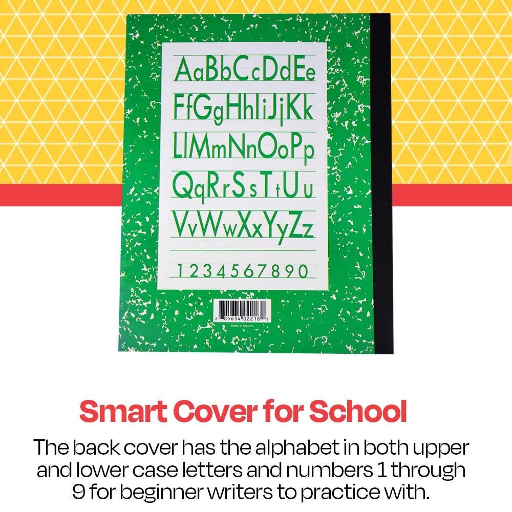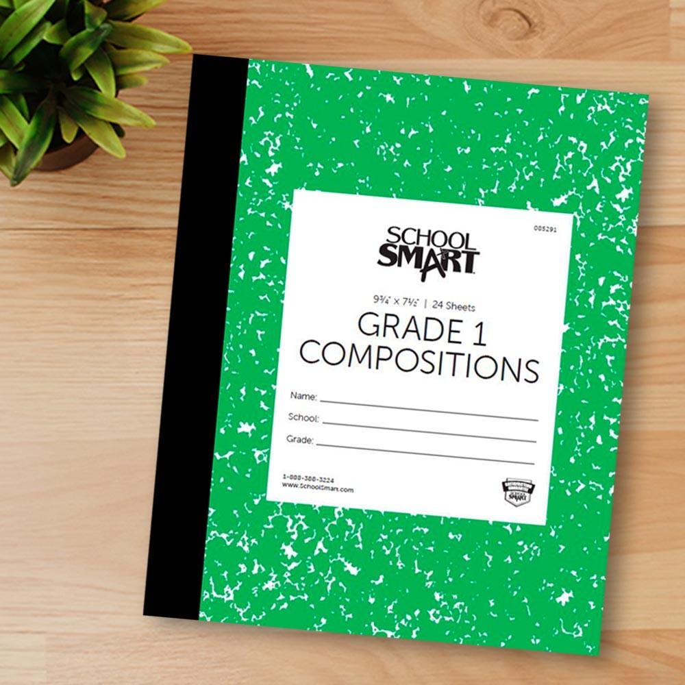 Grade 1 Composition Books measure 9-3/4 x 7-1/2 inches and have a flexible green marble pattern cover. Books contain 24 sheets/48 pages with 1-inch ruling and a 1/2-inch red margin and a skip space that offers room for beginning writers.