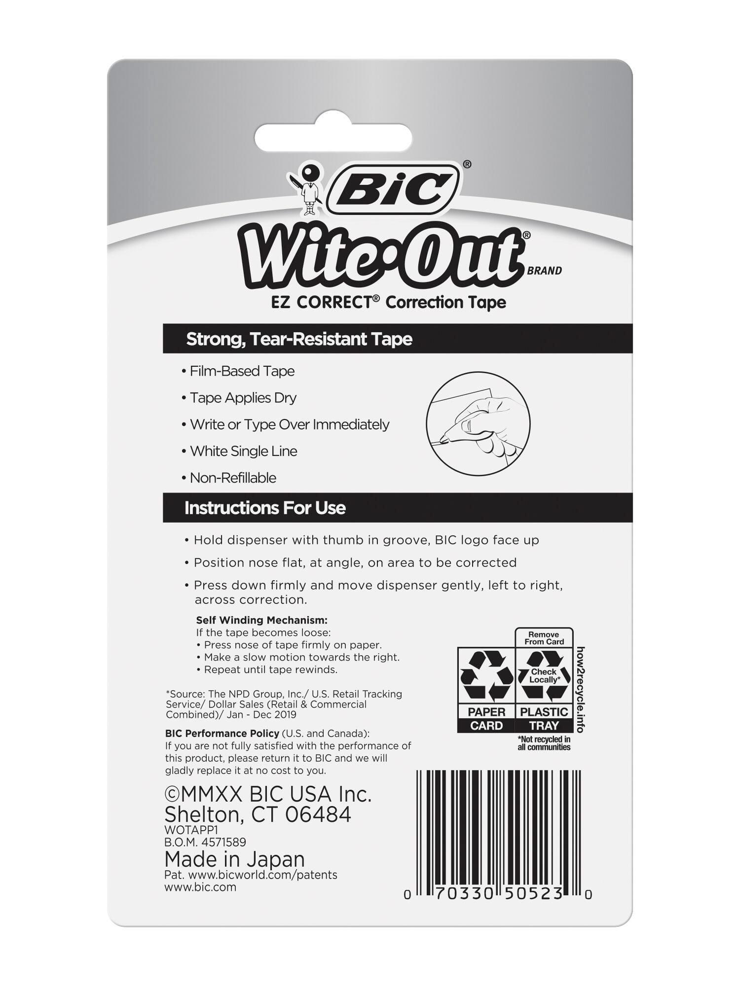The BIC Wite-Out EZ Correct Correction Tape delivers an easy, clean, and quick way to fix mistakes. The quality correction tape applies dry, so you can write or print over the tape right away. The tear-resistant, film-based tape comes in a compact dispenser with a translucent body that allows you to see the remaining tape supply. This roll of correction tape measures 39-3/10 feet x 1/6 inch.Features