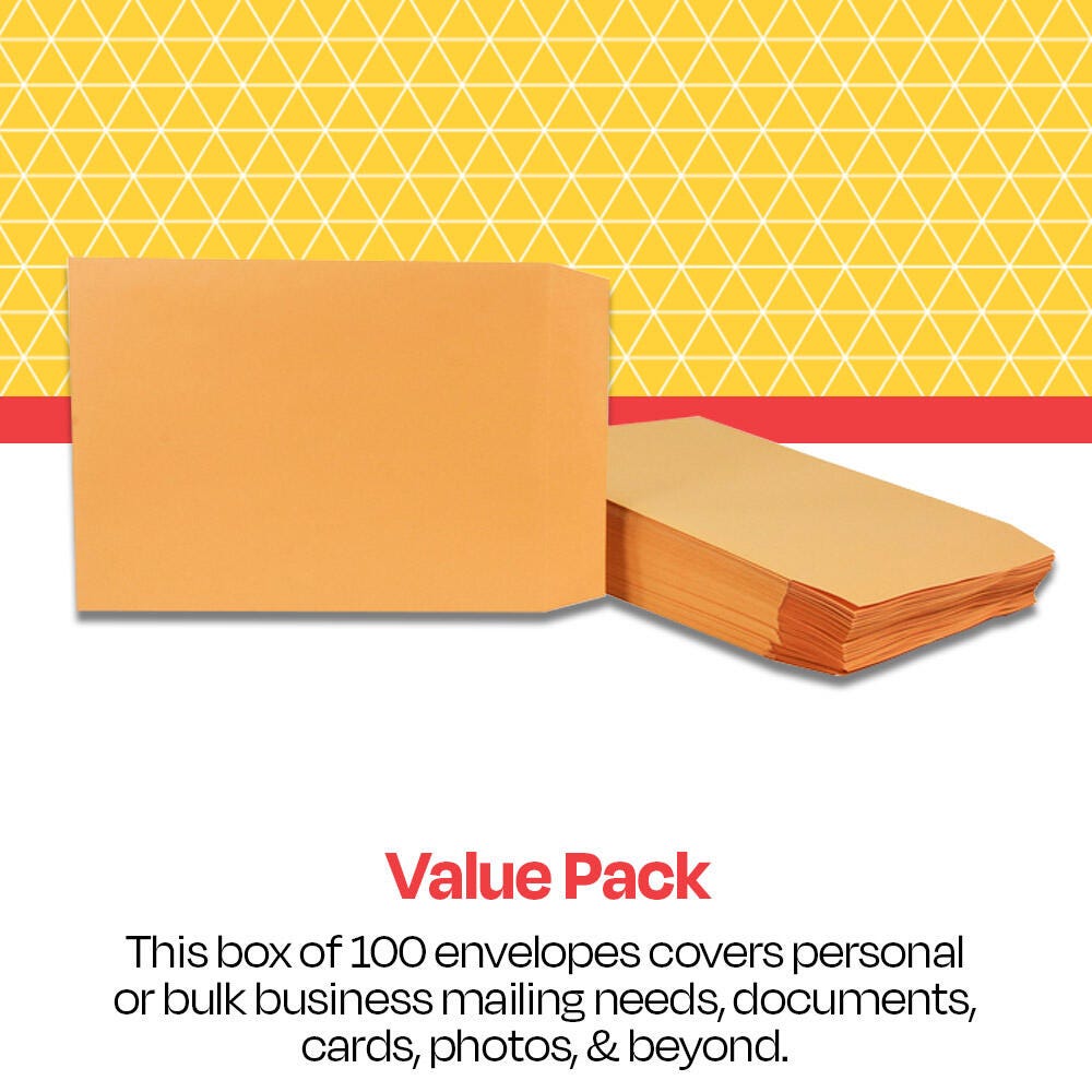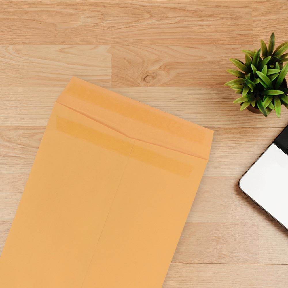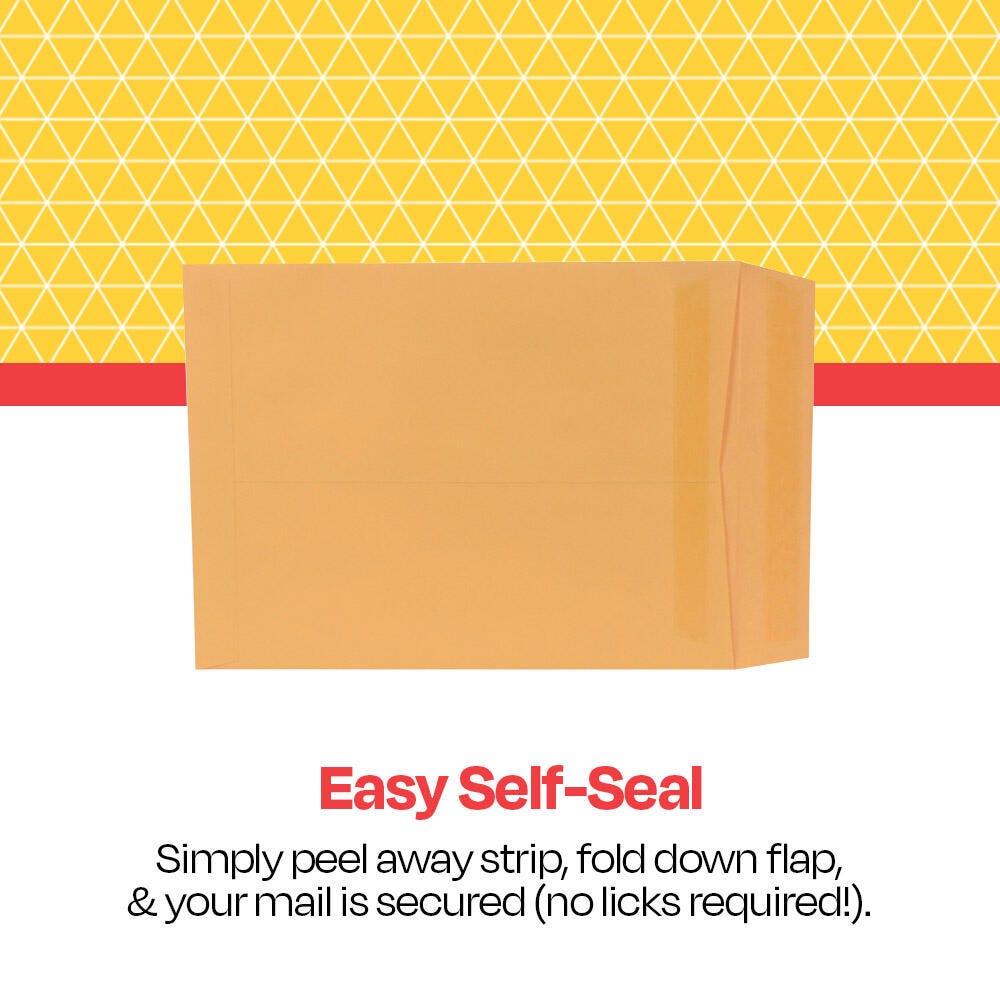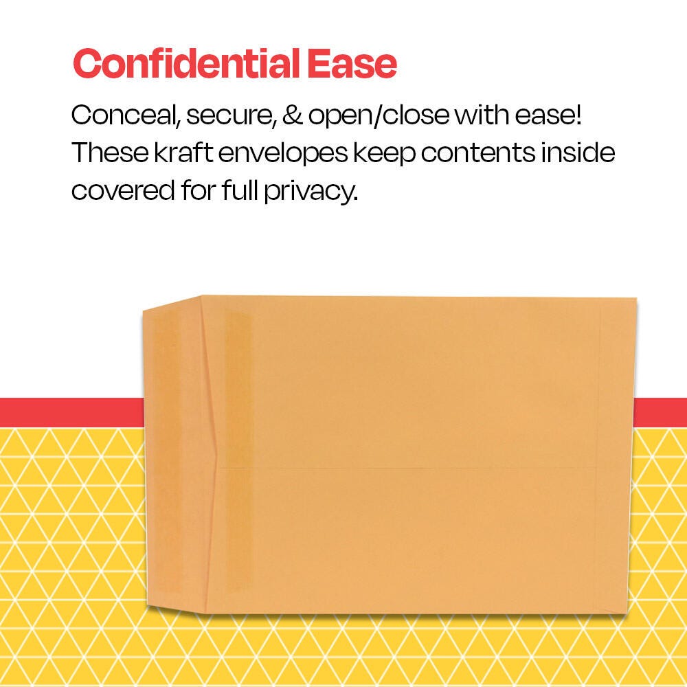 Handling documents just got easier with self sealing envelopes from School Smart! With a latex adhesive, these envelopes instantly seal shut for secure handling by just peeling away the strip and folding down the flap! While also keeping your documents private, the blank space on the outside of these secure envelopes offers ample room for addresses or content notes. These brown Kraft envelopes are made from 28 lb stock and measure 9 x 12 inches each. Sold as a pack of 100.