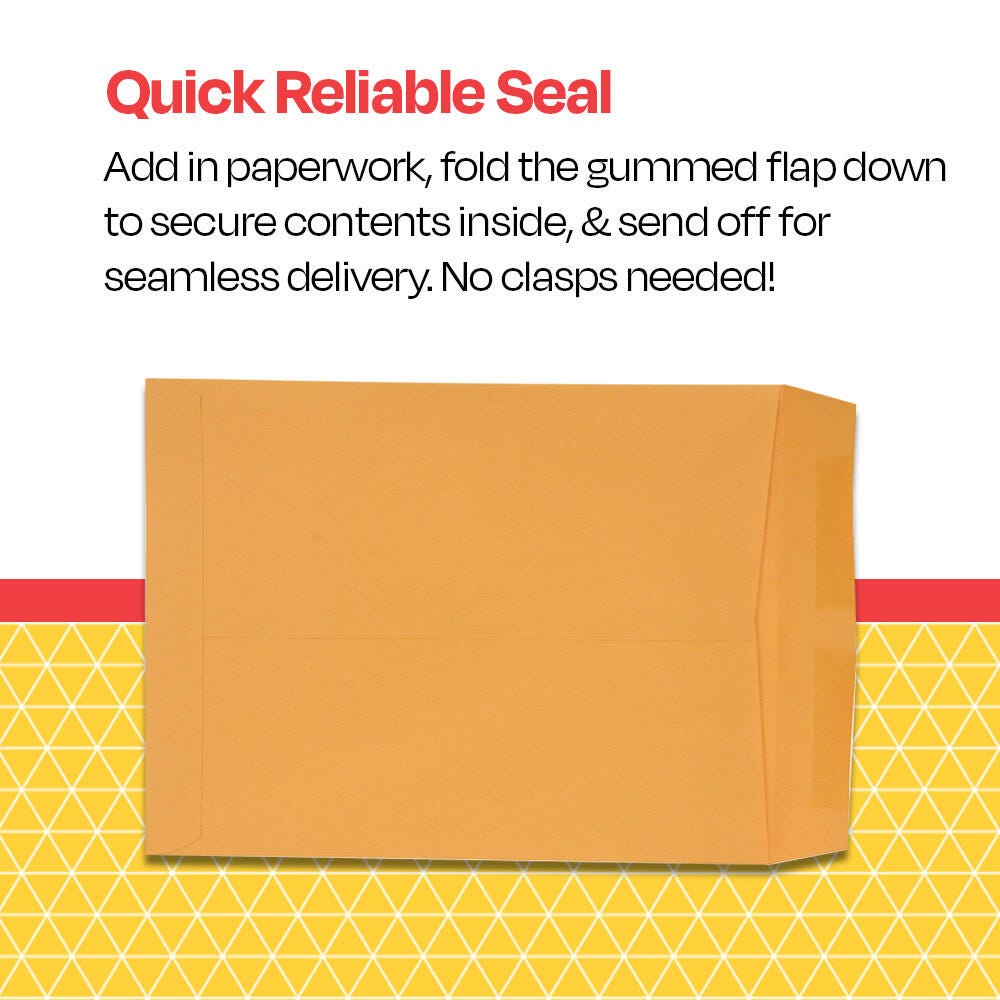 Gummy seal flap on each envelope provides a quick seal and easier packaging than traditional clasp envelopes