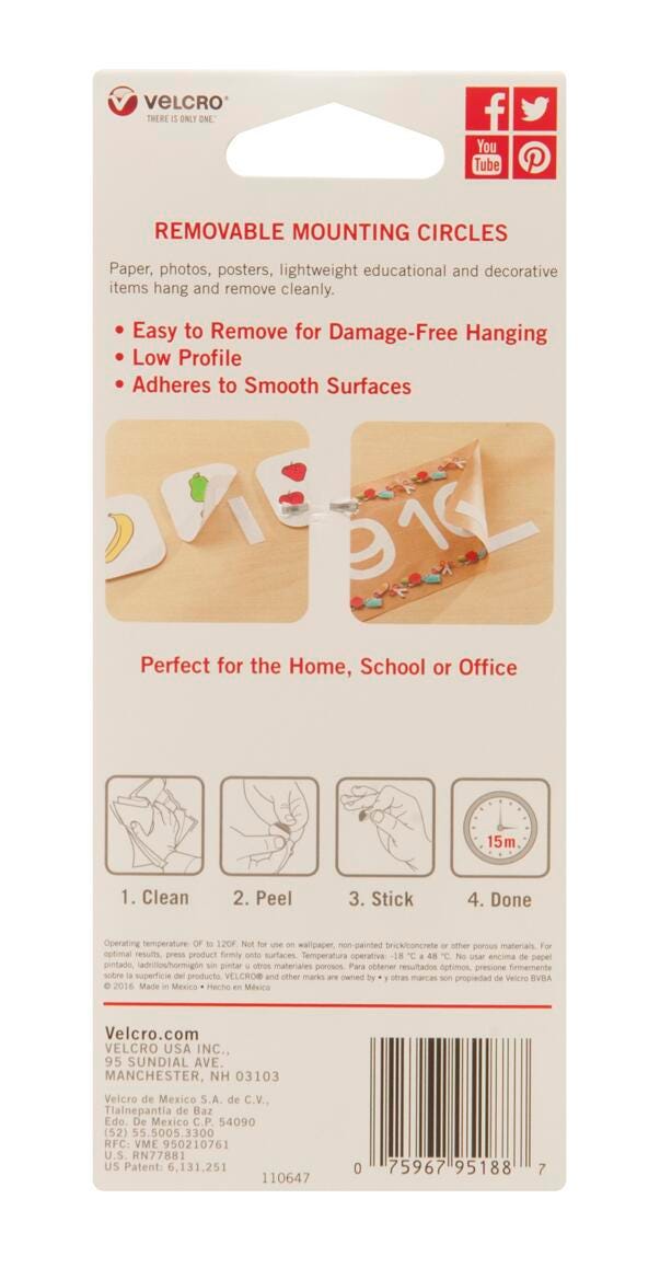 VELCRO Brand Hook and Loop removable mounting circles make it simple to hang papers, photos, posters or other light weight items with no hassle and no damage to surfaces.