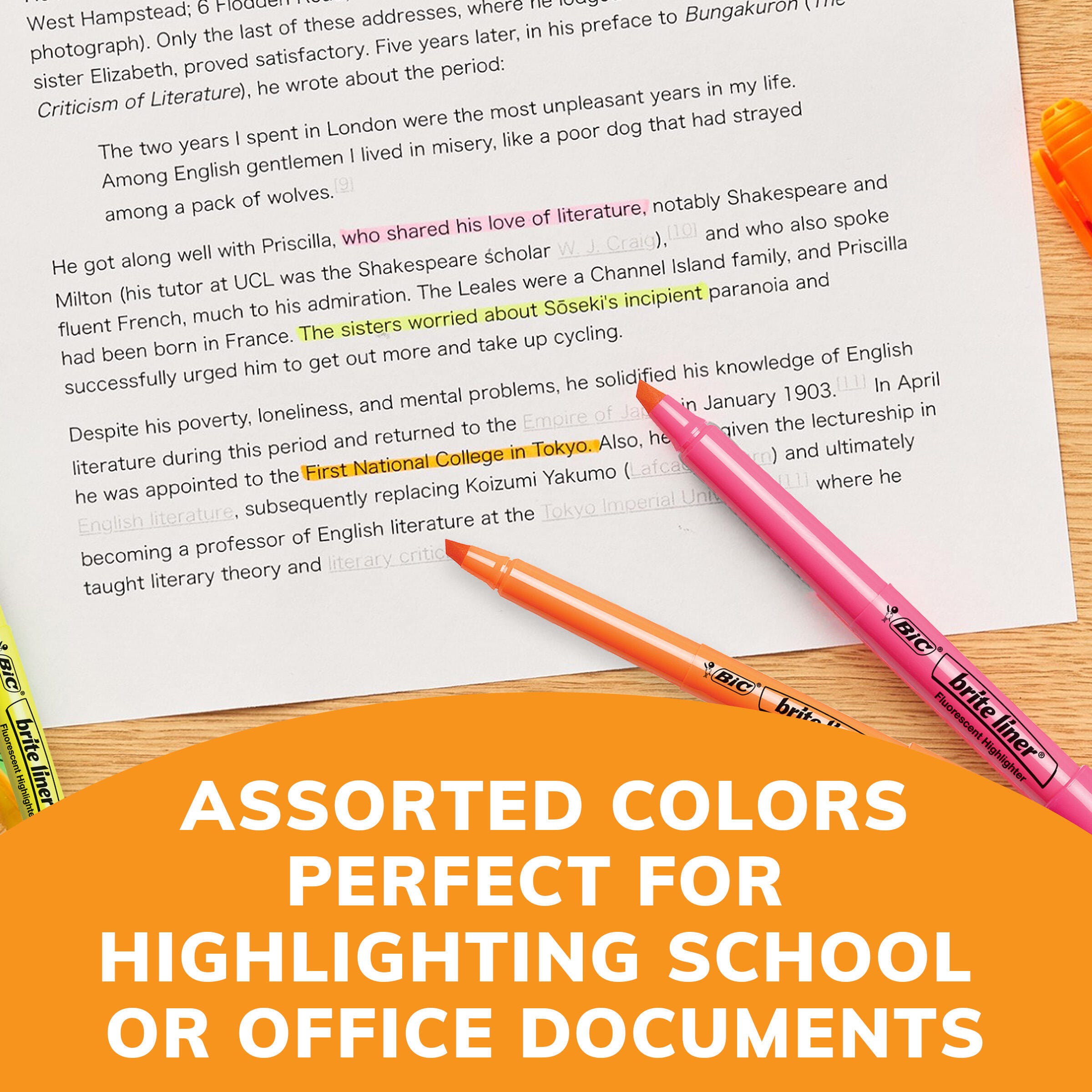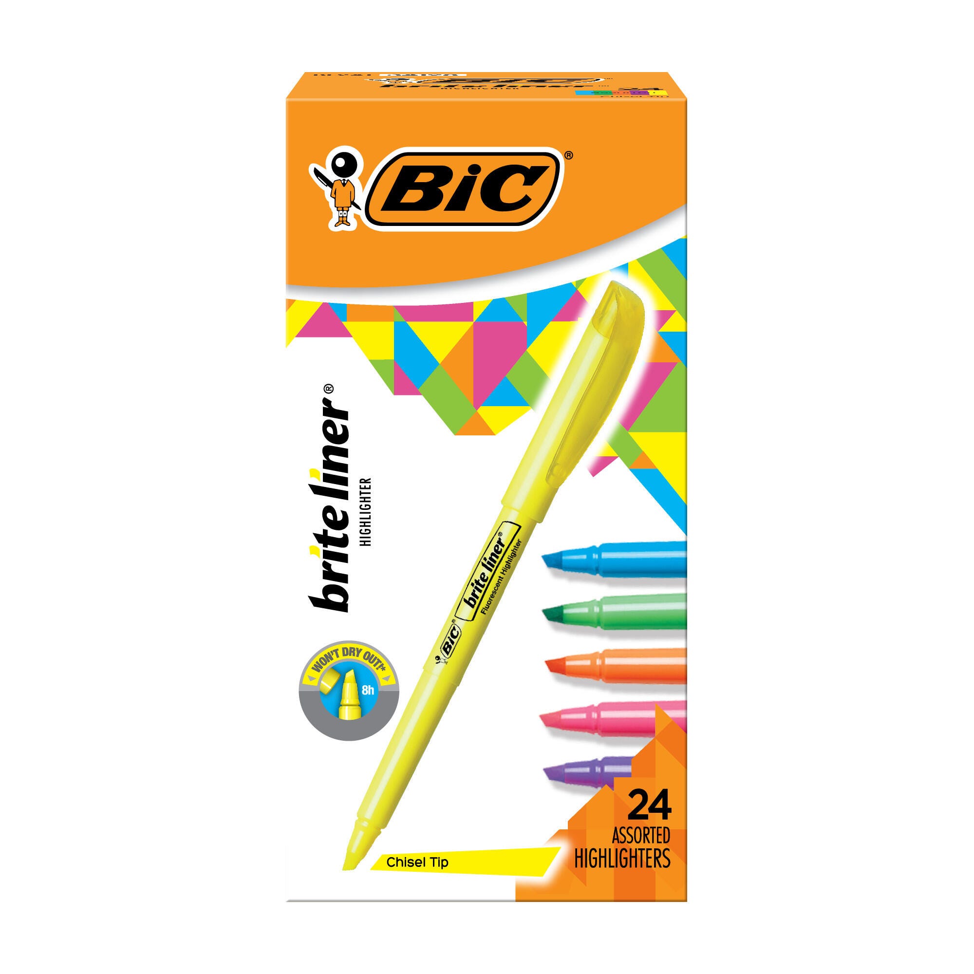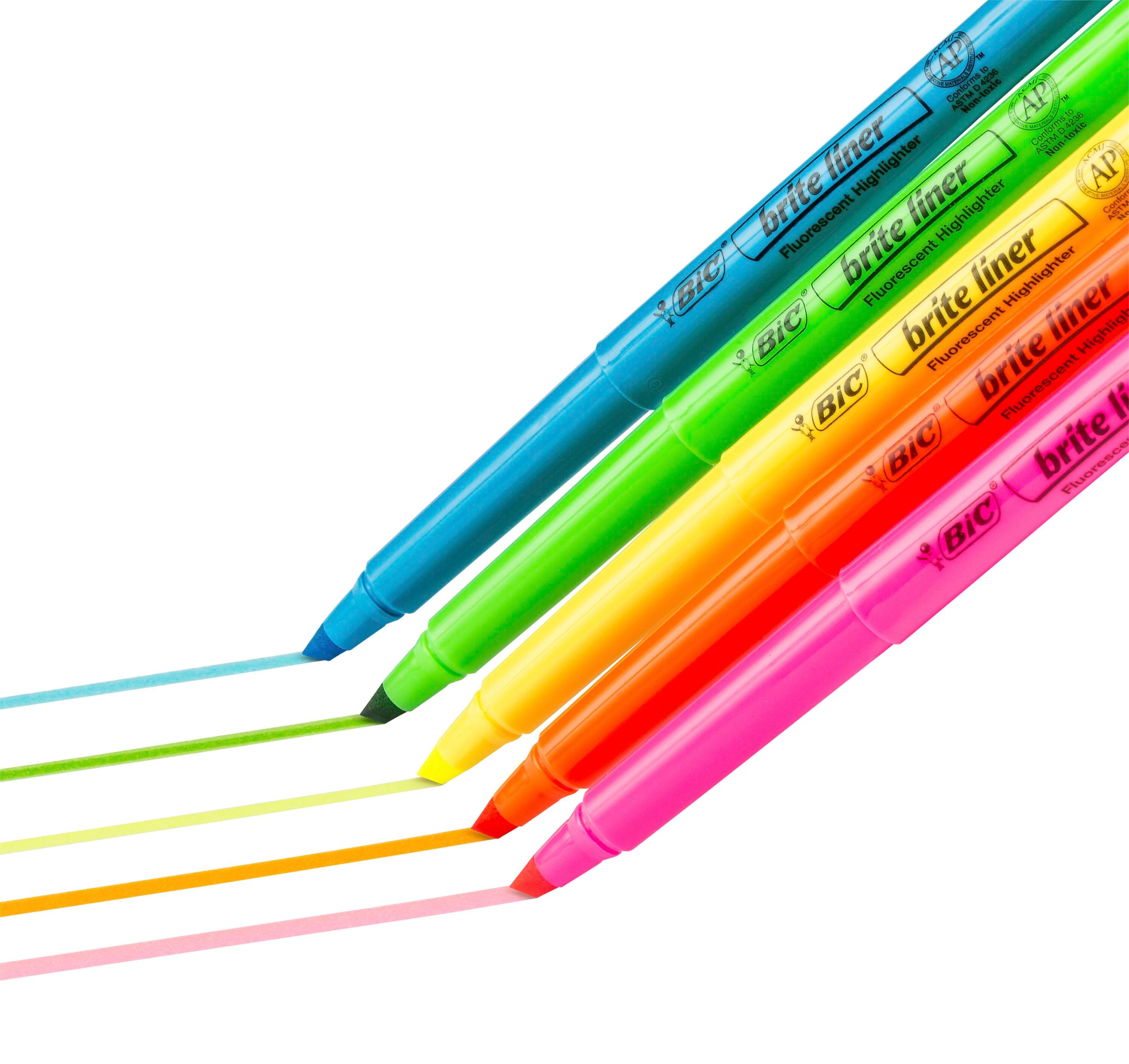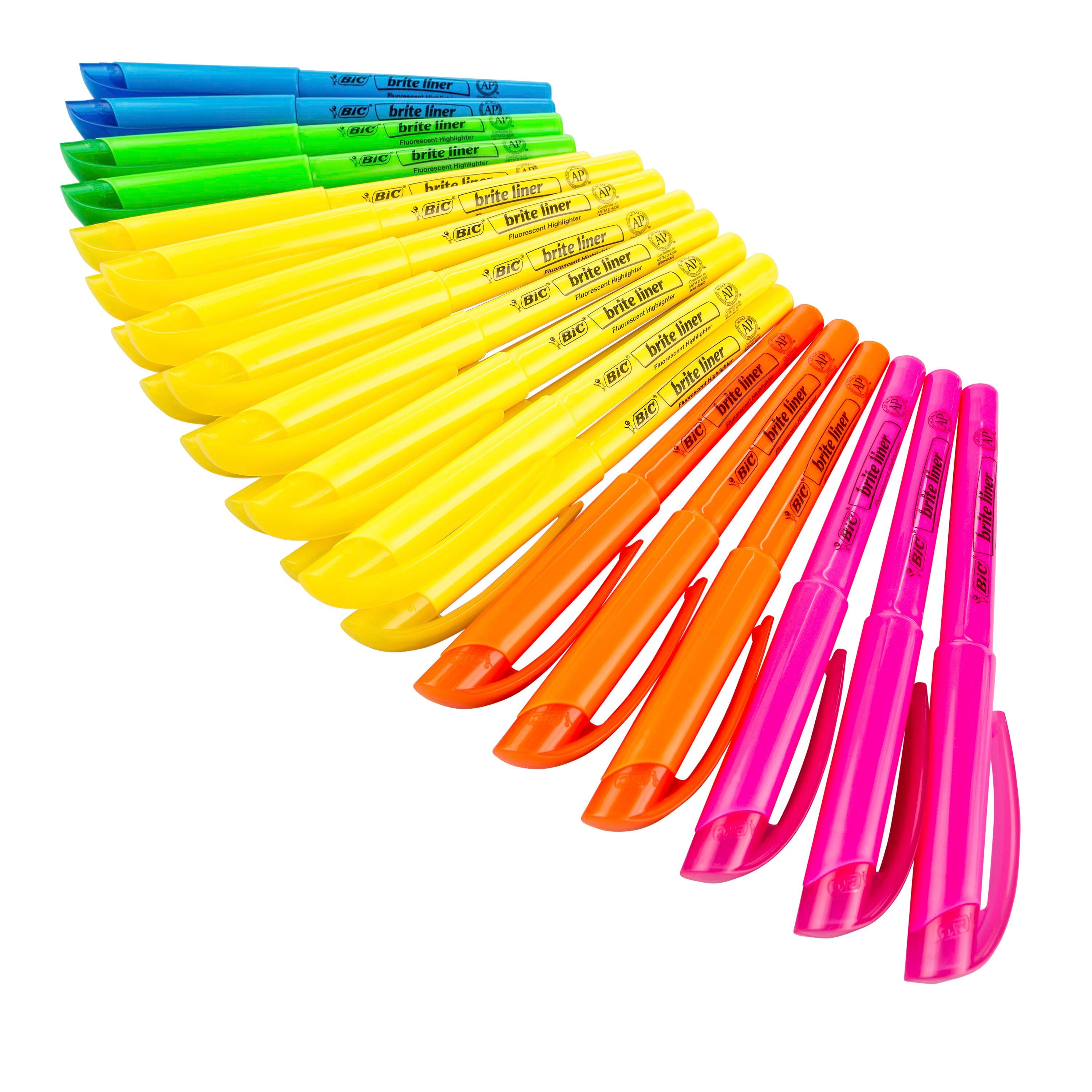 The BIC Brite Liner Pocket Style Highlighter features a durable chisel point tip that makes it easy to highlight in neat lines with a consistent width. The translucent ink pops right off the page without covering or smudging highlighted text. A pen-shaped design provides an easy and comfortable grip. A must-have for any classroom or office that brings color to reading and organizing. 24 highlighters per pack in assorted colors.