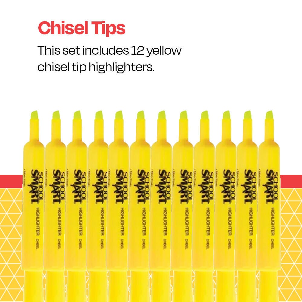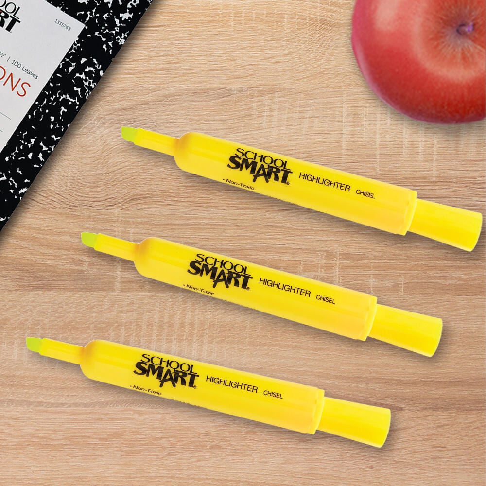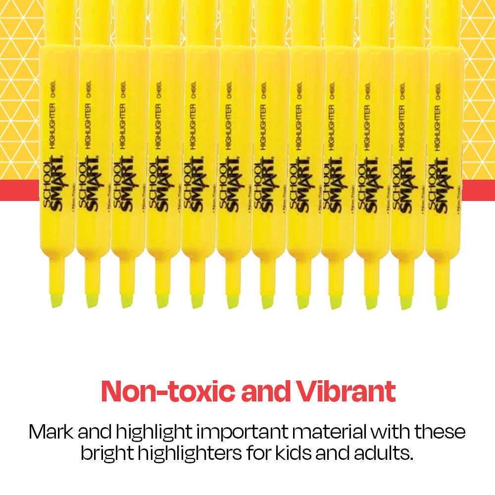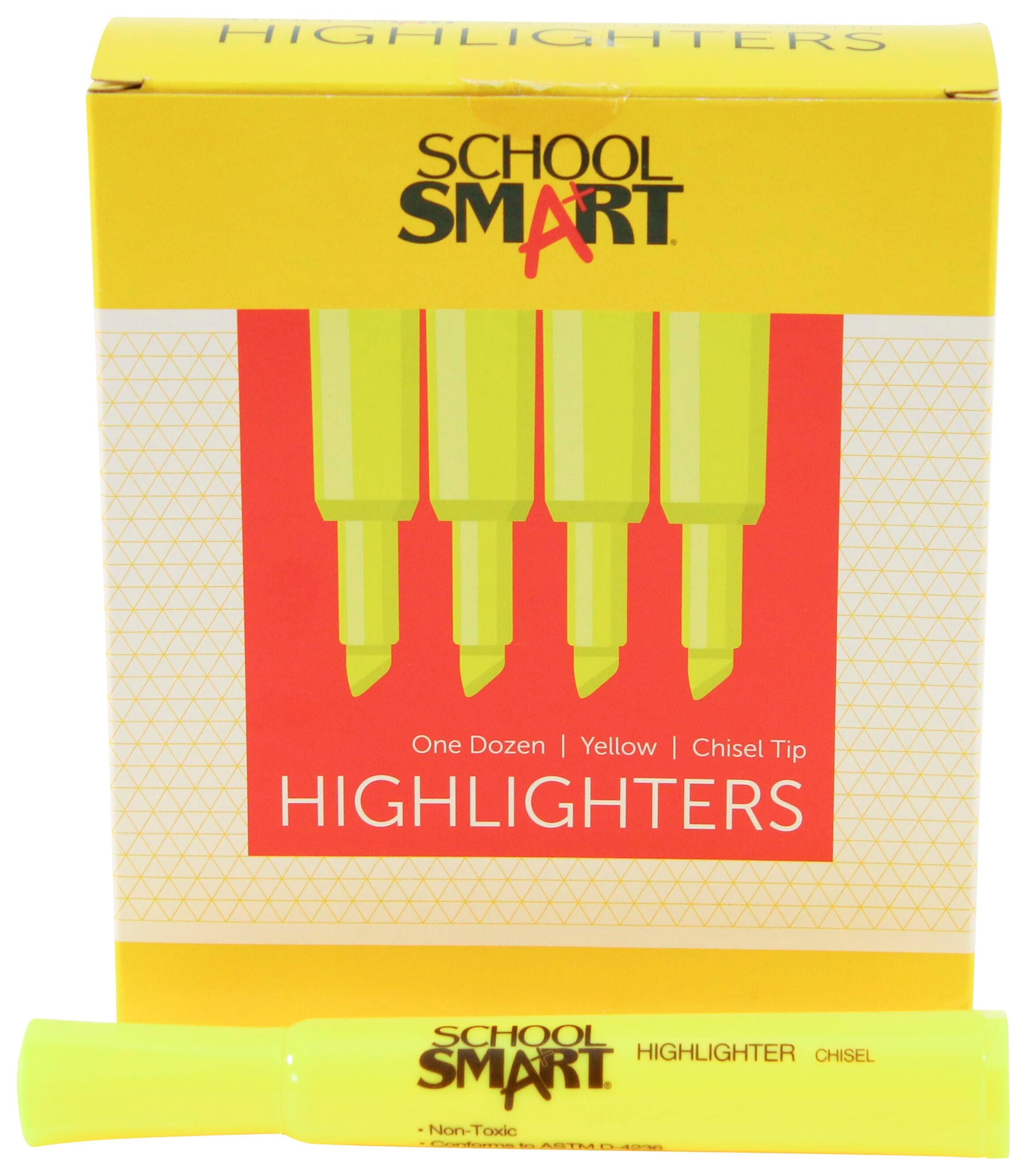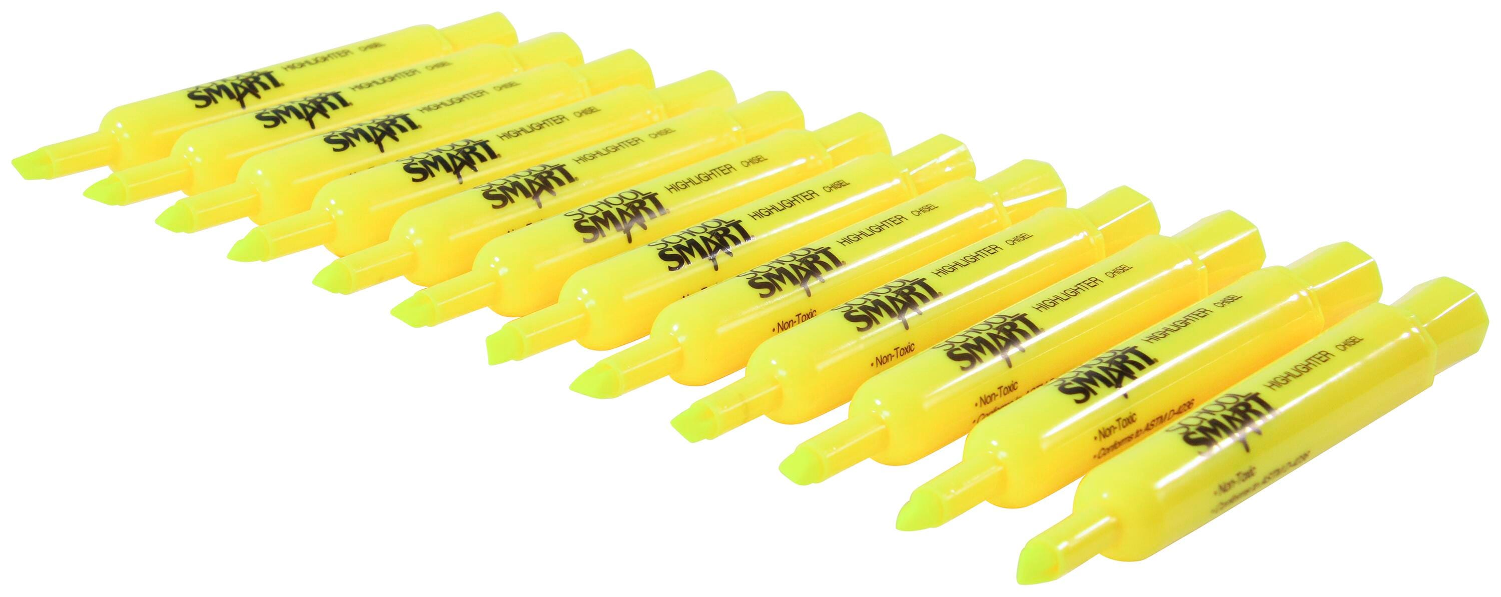 Mark up your notes in style with School Smart neon yellow highlighters. Our tank highlighters are comfortable to hold and have a broad line tip for more highlighting options. Students, teachers, and office professionals love the easy-to-hold large barrel. The chisel tip highlighters allow for wide or fine highlighting while the see-through ink is bright and noticeable.