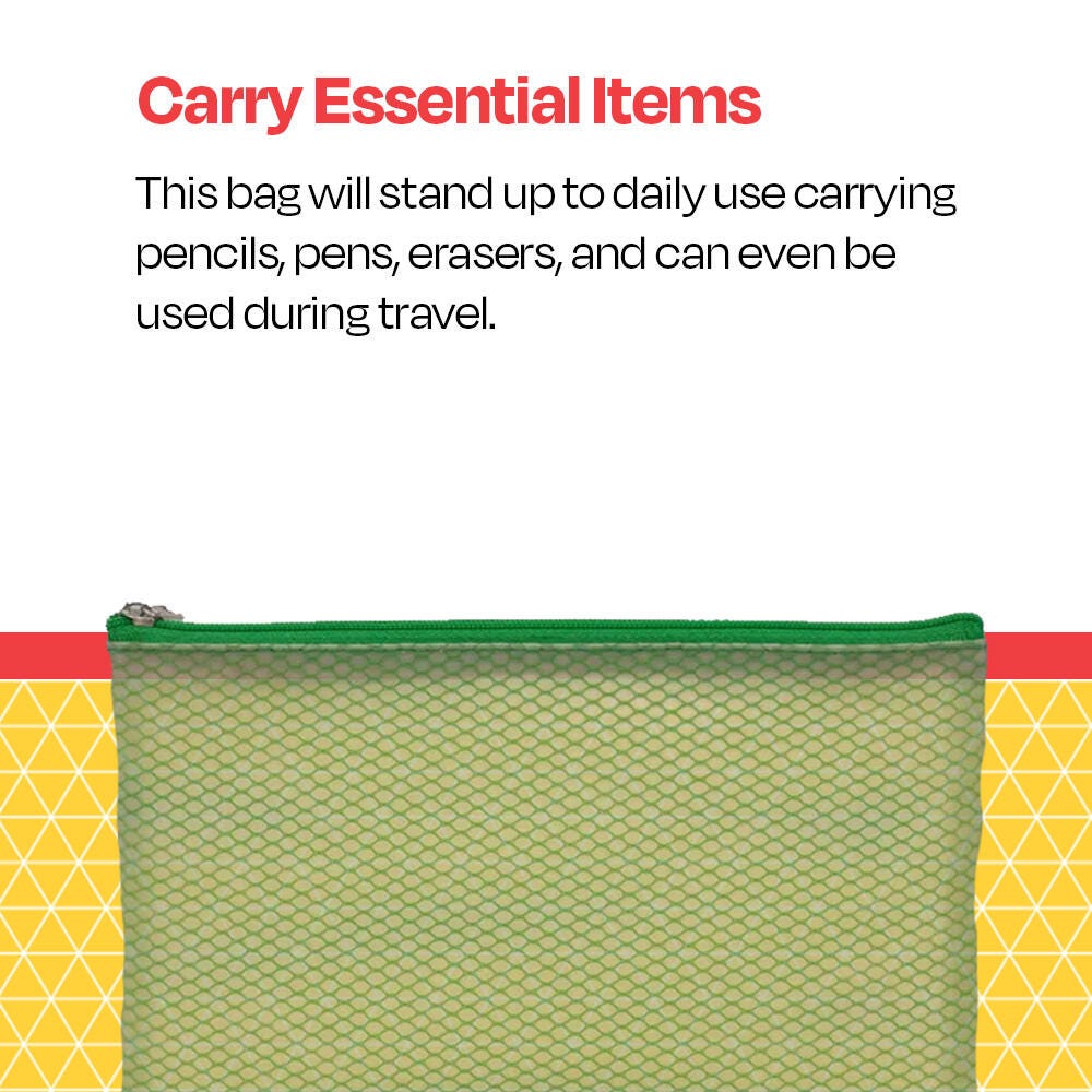 Keep your pens, pencils, and small items all in one spot with the School Smart pencil case. Made from vinyl and with an exterior mesh webbing and a zipper, the translucent pencil pouch has a fun design for all ages.