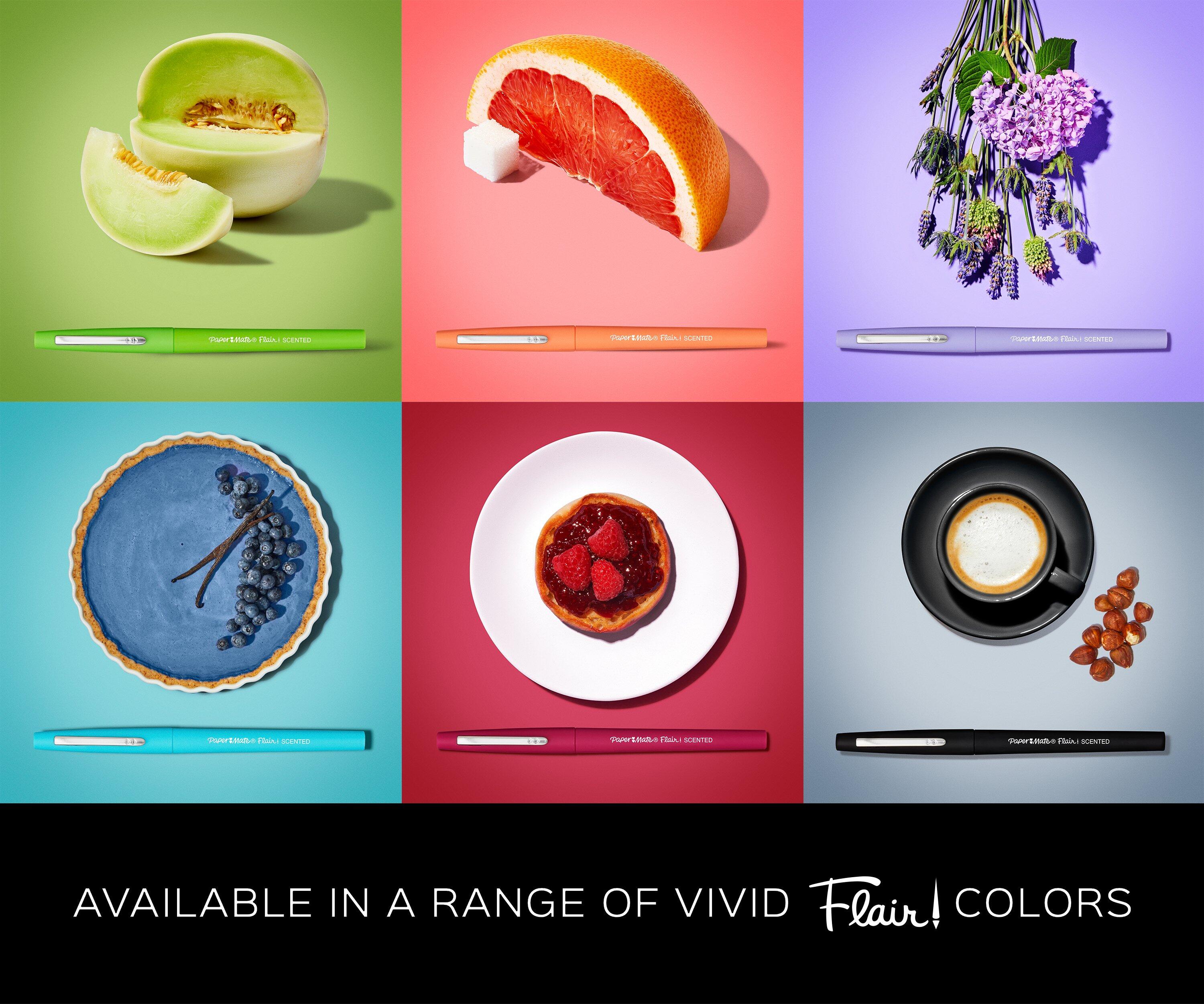Enjoy the smell of sweet Sugared Grapefruit or rich Hazelnut Latte with the Paper Mate Flair Scented Sunday Brunch Pens. These pens deliver the same vivid Flair color with the addition of irresistible scents. The pens feature Point Guard technology and smear-resistant ink that won't bleed through paper so your work stays neat. Experience the fun of Sunday Brunch with Paper Mate Flair! This set contains 6 brunch-themed colors with coordinated scents.