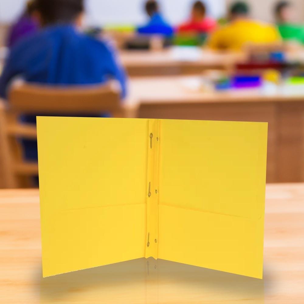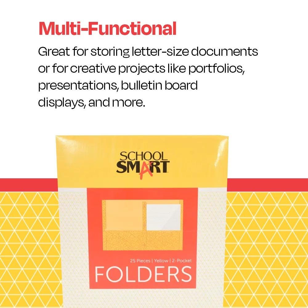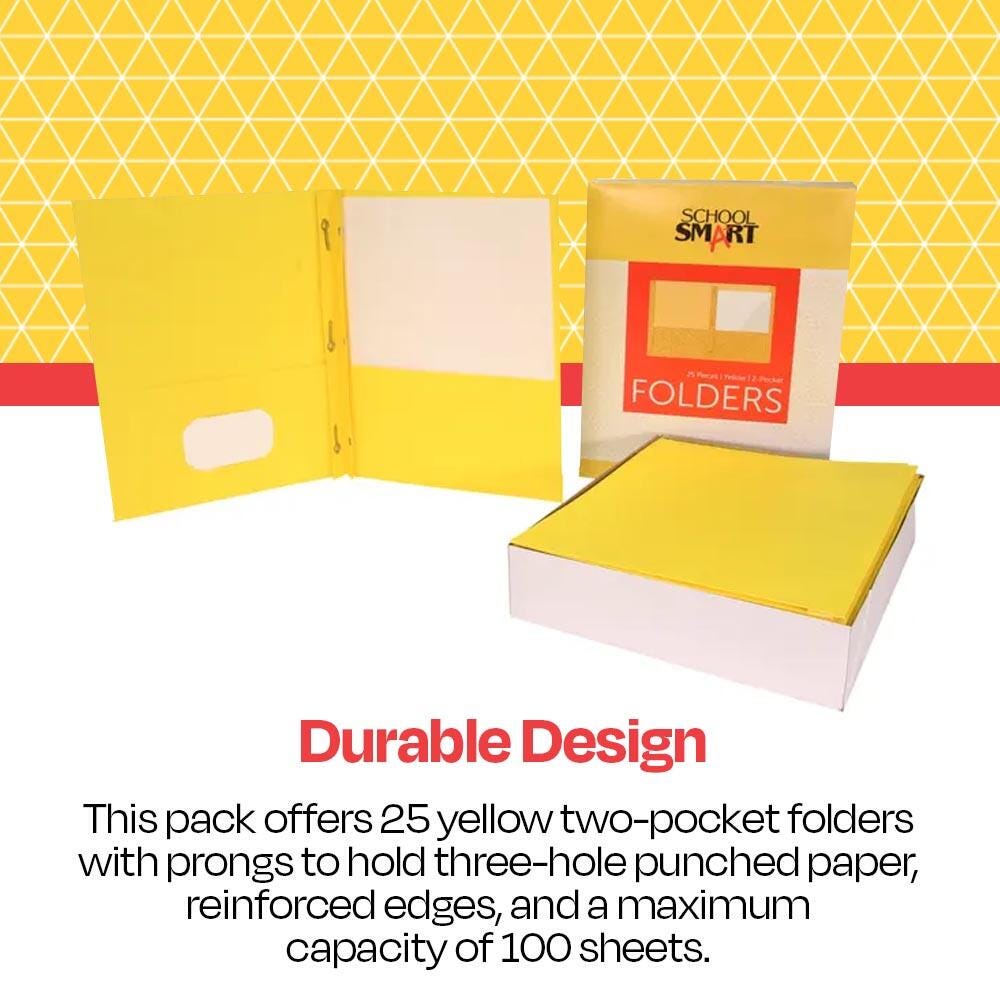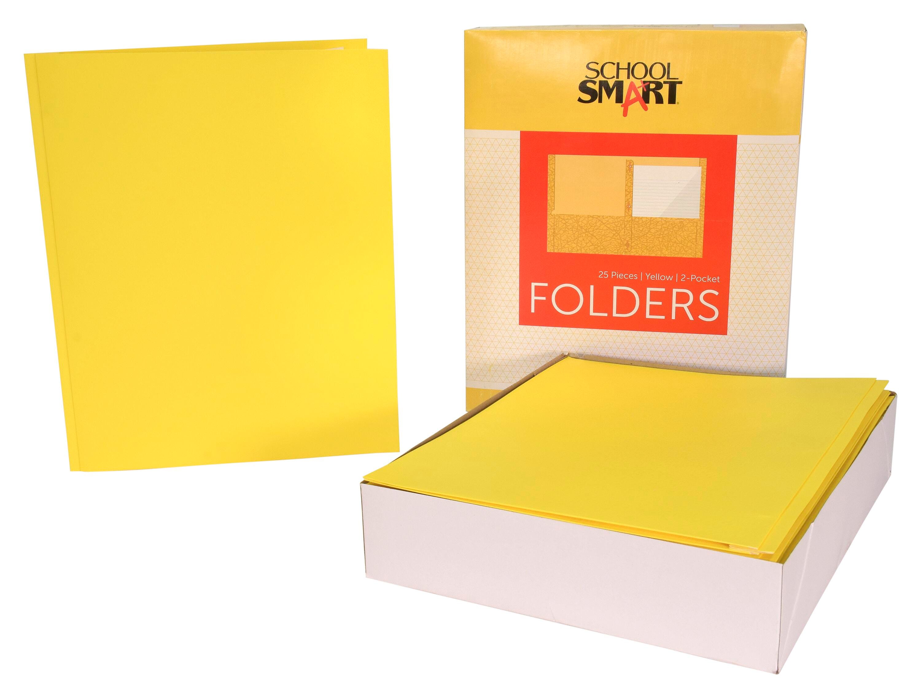 This set of School Smart 2-pocket folders with fasteners comes in a bright yellow color. Each twin pocket file portfolio holds 8-1/2 x 11 inch sheets. An expandable gusset insert with three fasteners fits standard 3-hole punched sheets for extra storage. The pocket folder with prongs can be used for daily storage, protection for important documents, or as a report cover for school. An embossed finish with double reinforced edges provides extra durability.