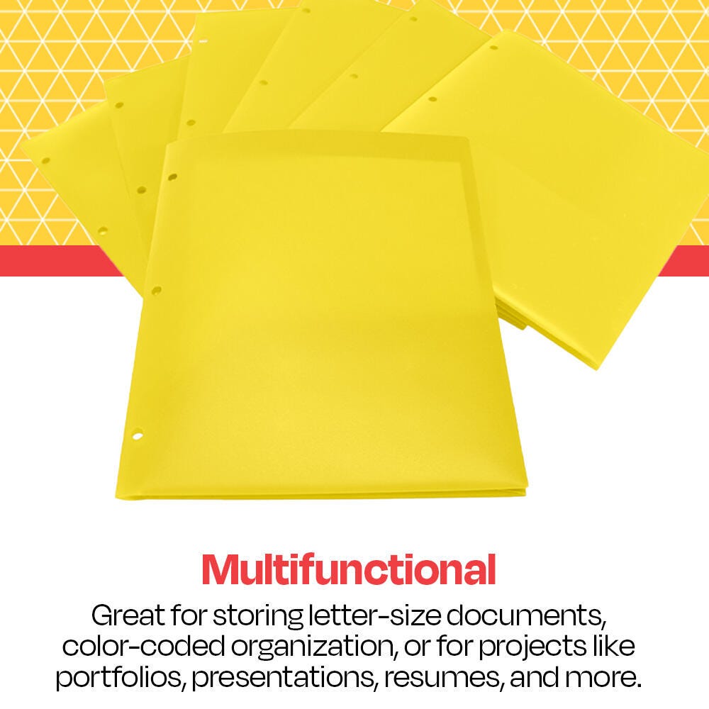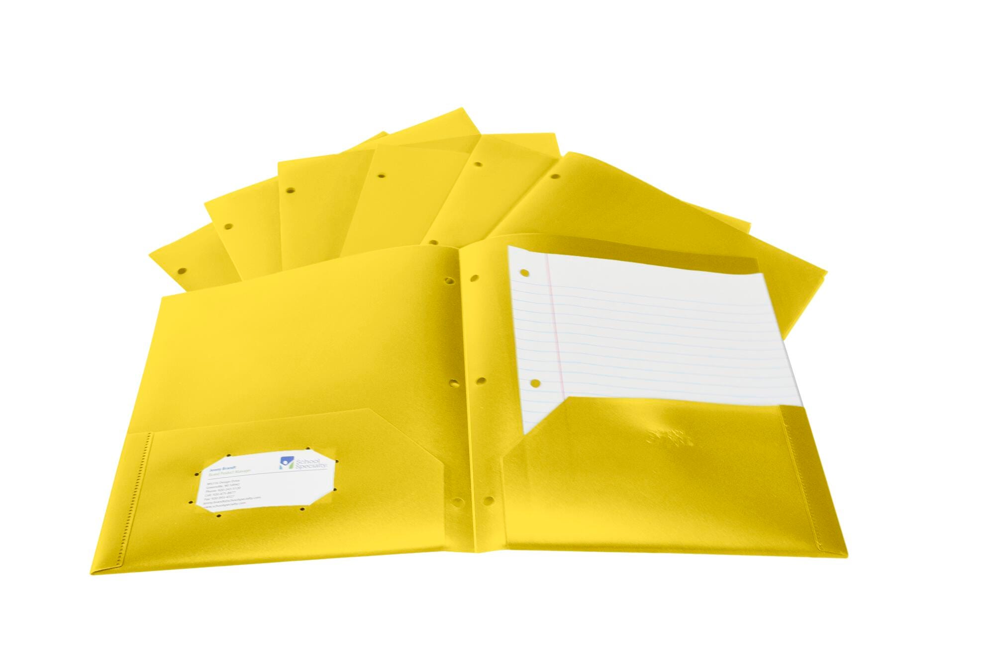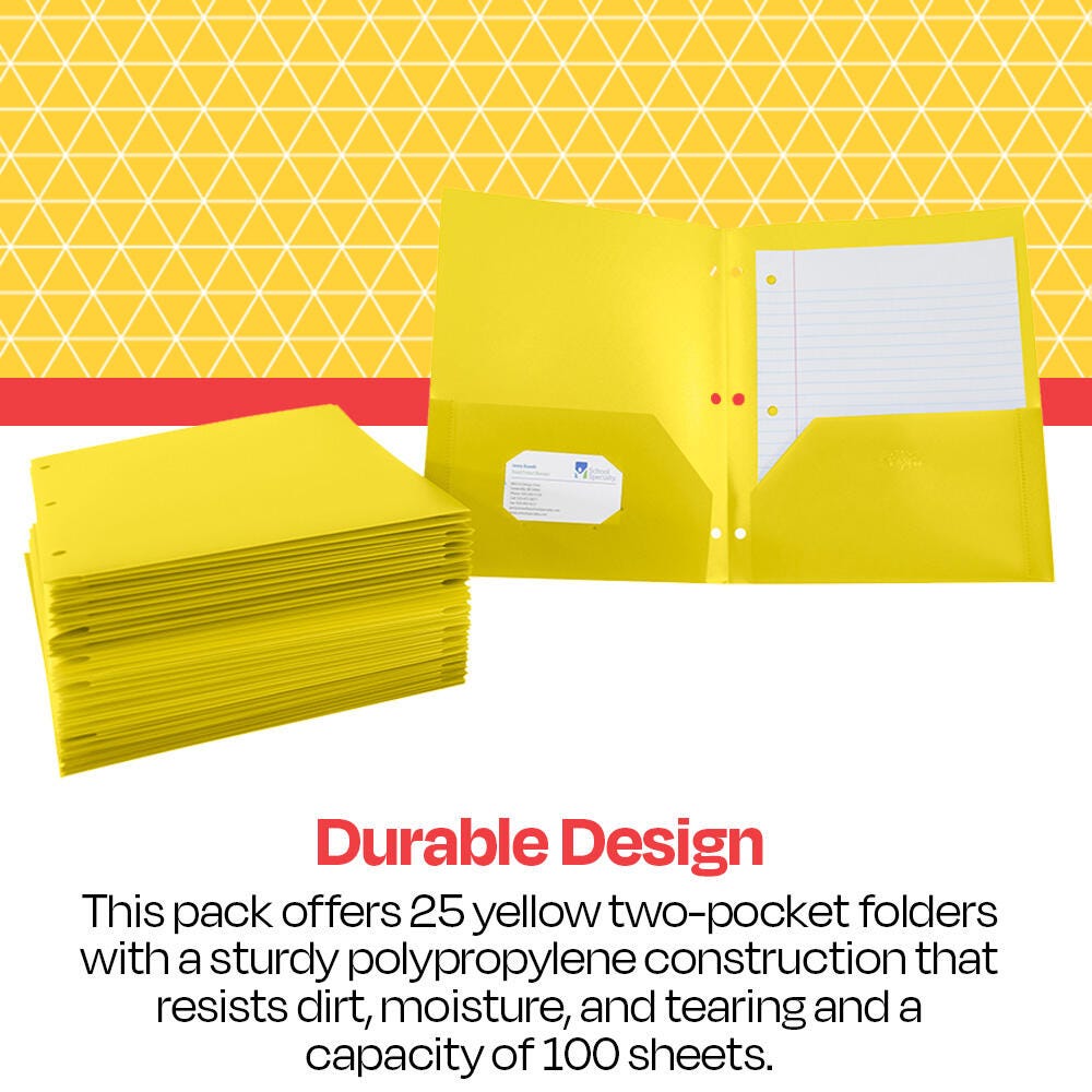 School Smart's 2-Pocket Folders help you compile and file your papers and documents with ease. These flexible and lightweight folders are made of durable polypropylene that resists moisture and dirt to keep your papers protected during storage or transport. Each folder has a left interior pocket with a business card slot, and is 3-hole punched to fit seamlessly into standard three-ring binders for even more organization options. These folders are designed to hold letter-size, 8-1/2 x 11-inch sheets. This pack contains 25 yellow folders.
