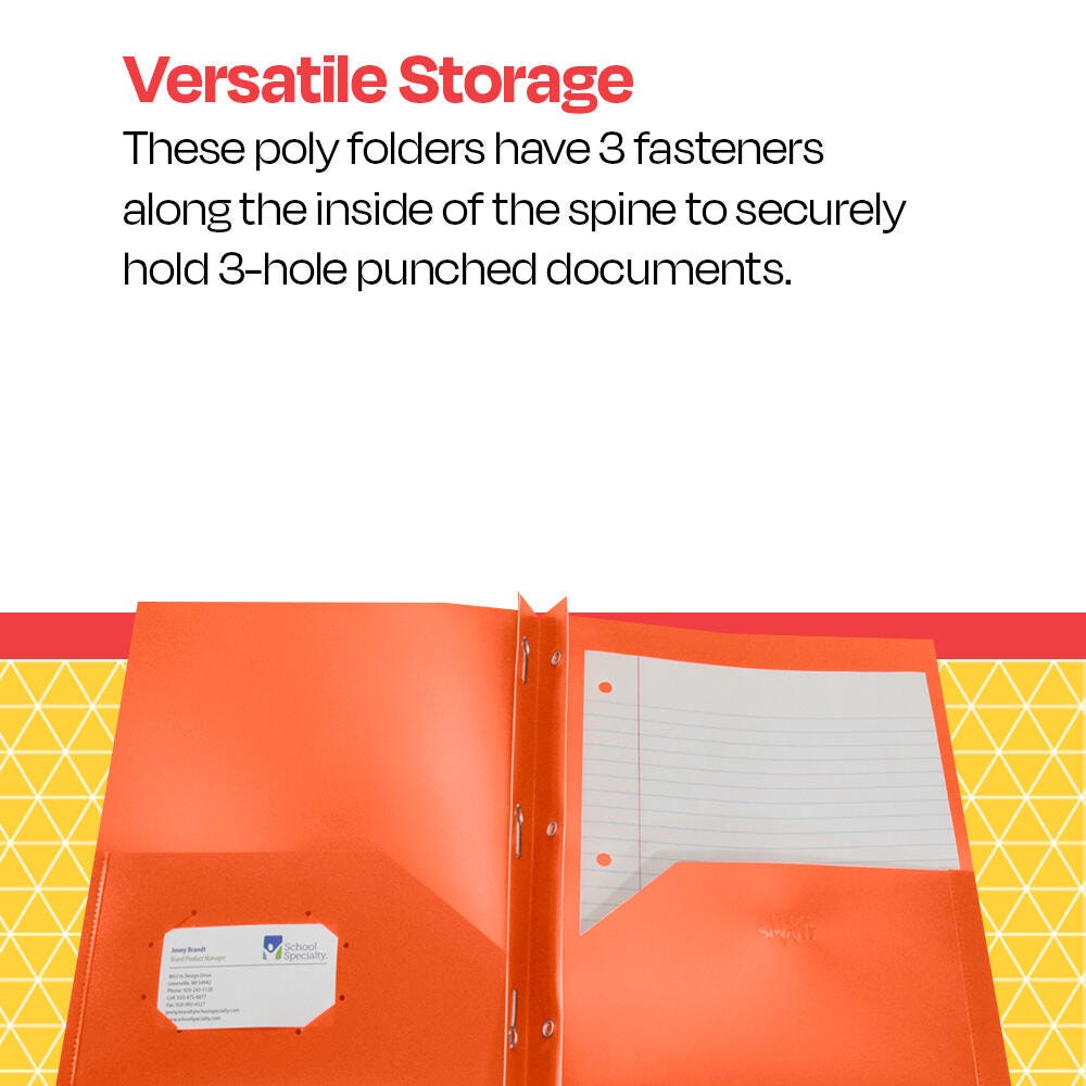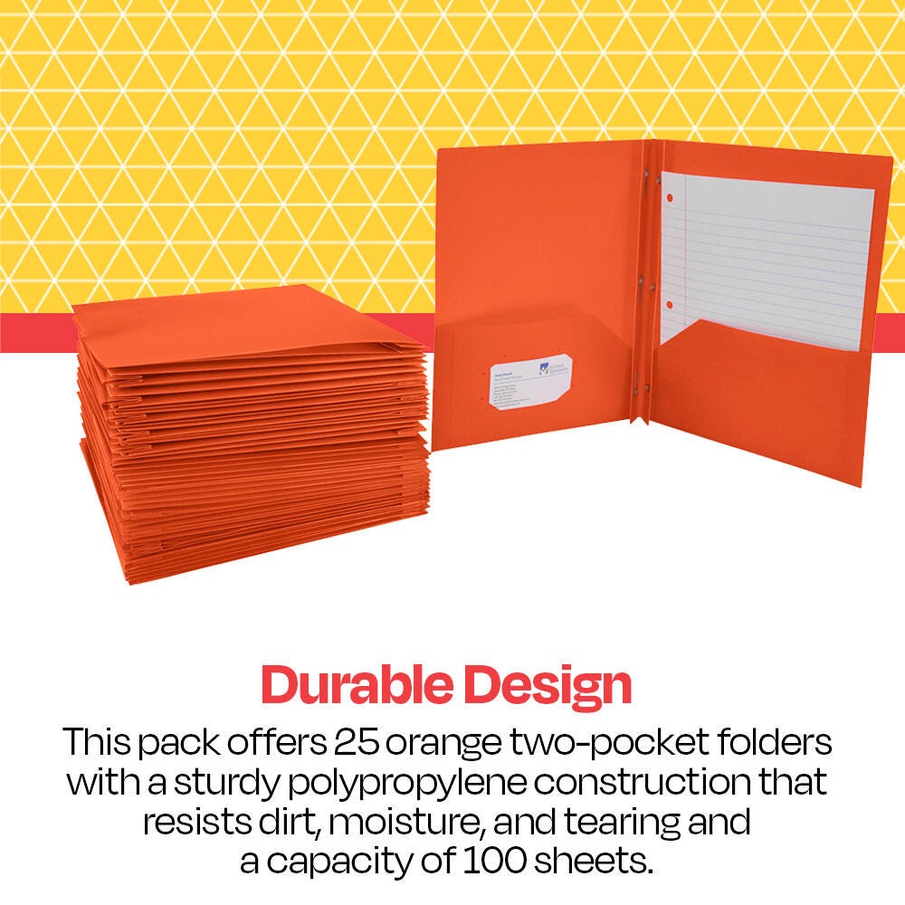 Experience reliable document storage and versatile organization with School Smart's 2-Pocket Folders. Flexible and lightweight, each folder has a durable polypropylene construction that resists moisture and dirt. These folders have a left interior pocket with an integrated business card slot and an insert with push-down prong fasteners to secure 3-hole punched documents. The folders are designed to hold letter-size 8-1/2 x 11-inch sheets. This pack contains 25 orange folders.Features