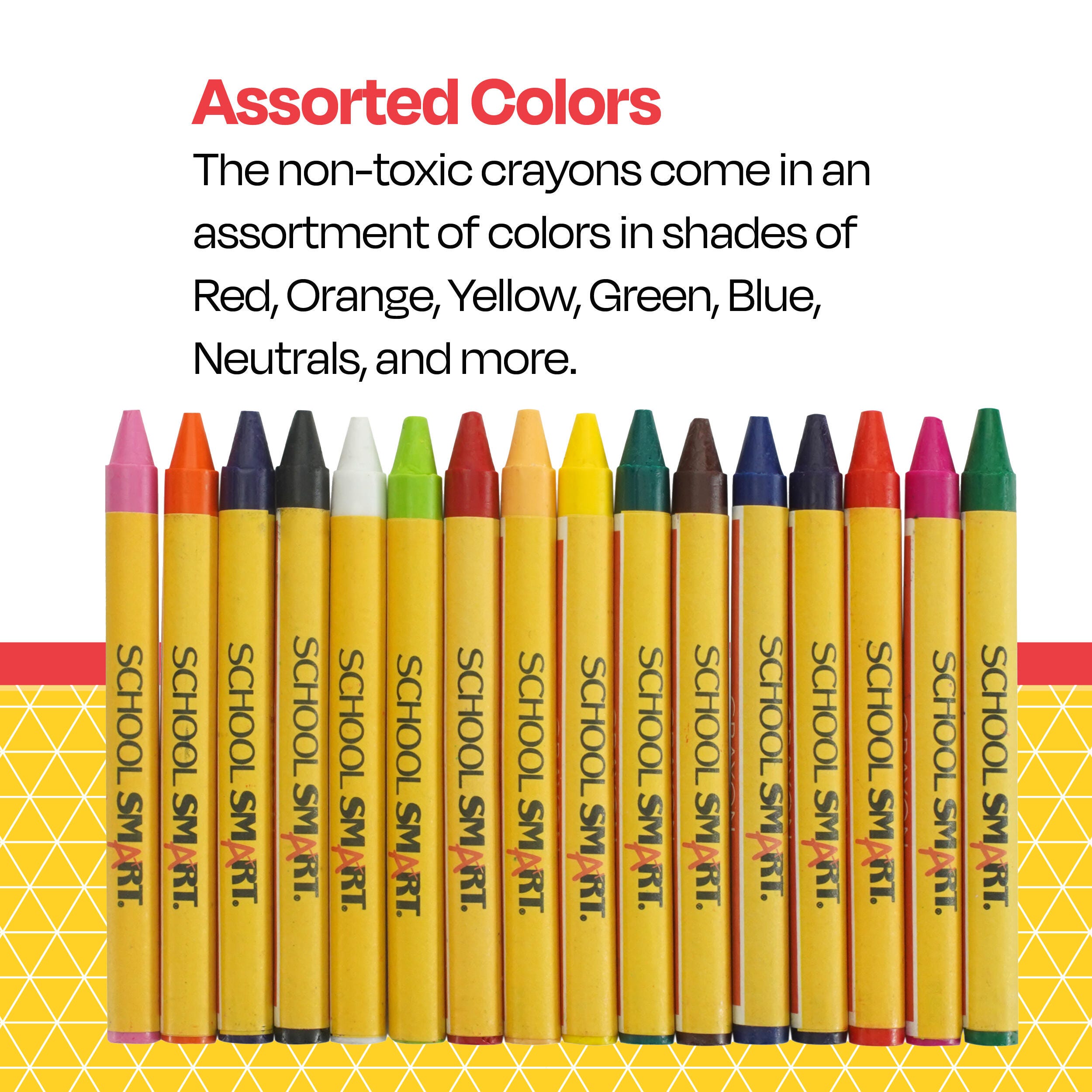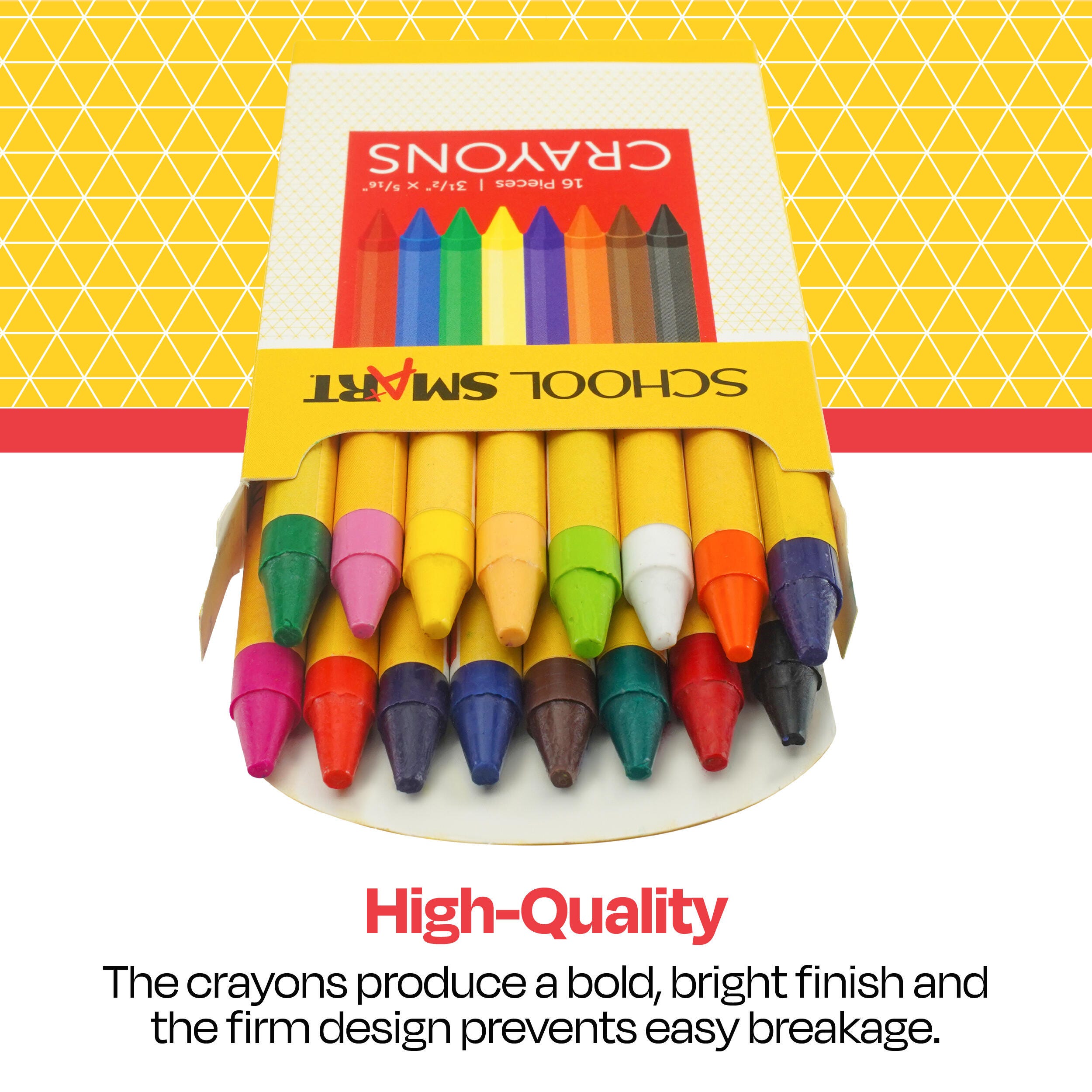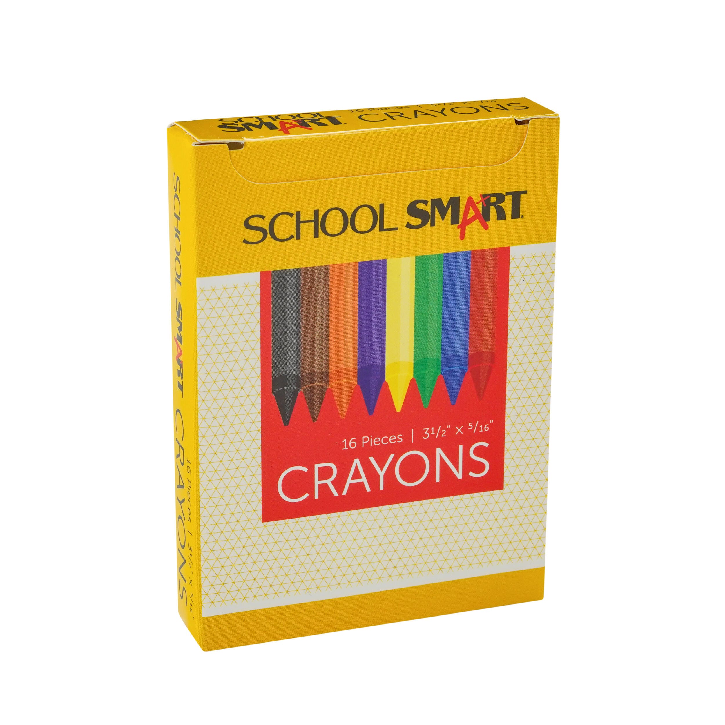 School Smart regular crayons in assorted colors come in a standard box size; each crayon measures 3 1/2 L x 5/16 D inches. These crayons are pliable enough to create narrow lines or broad coverage. Made of high-quality materials, these classroom crayons create a bright finish with featured intense pigments when coloring or drawing. This pack includes 16 crayons, 1 in each of the following colors: red, blue, green, yellow, violet, orange, brown, black, red-orange, pink, red-violet, white, blue-green, blue-violet, yellow-orange, and yellow-green.