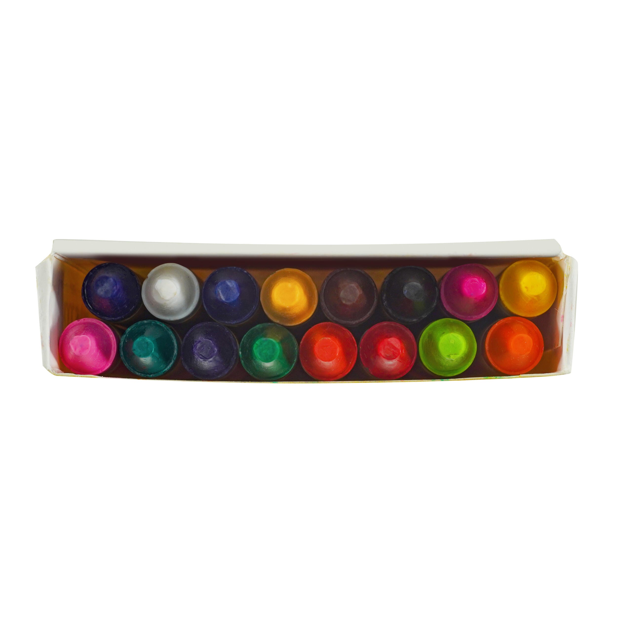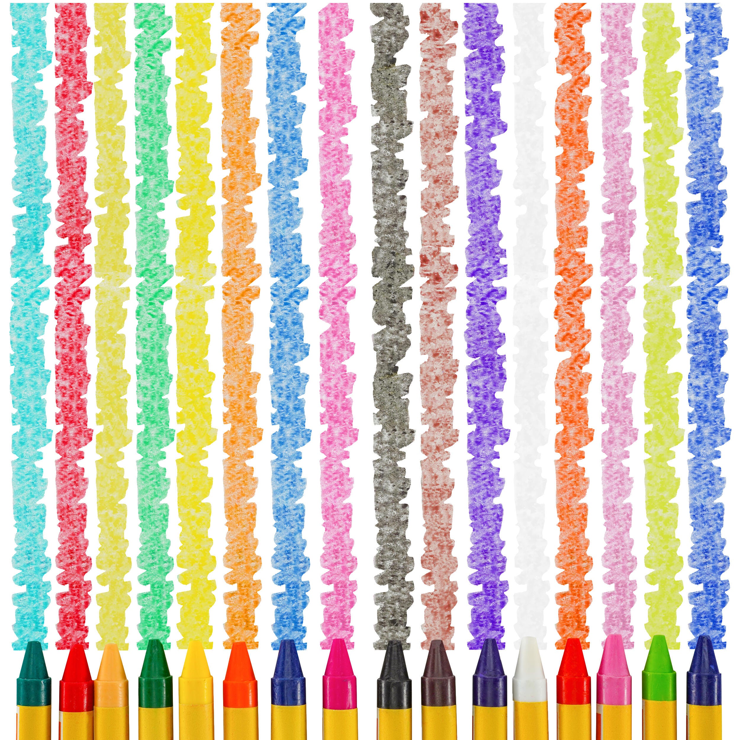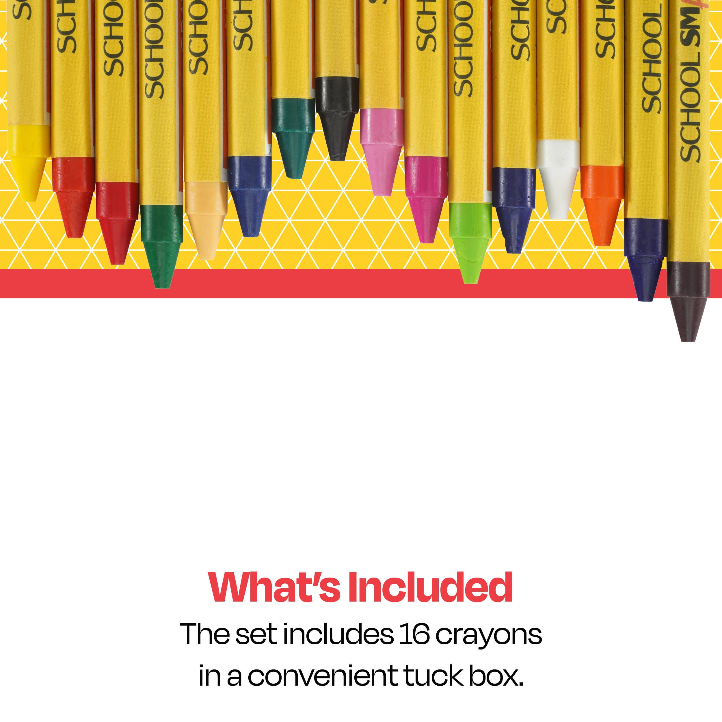 School Smart regular crayons in assorted colors come in a standard box size; each crayon measures 3 1/2 L x 5/16 D inches. These crayons are pliable enough to create narrow lines or broad coverage. Made of high-quality materials, these classroom crayons create a bright finish with featured intense pigments when coloring or drawing. This pack includes 16 crayons, 1 in each of the following colors: red, blue, green, yellow, violet, orange, brown, black, red-orange, pink, red-violet, white, blue-green, blue-violet, yellow-orange, and yellow-green.