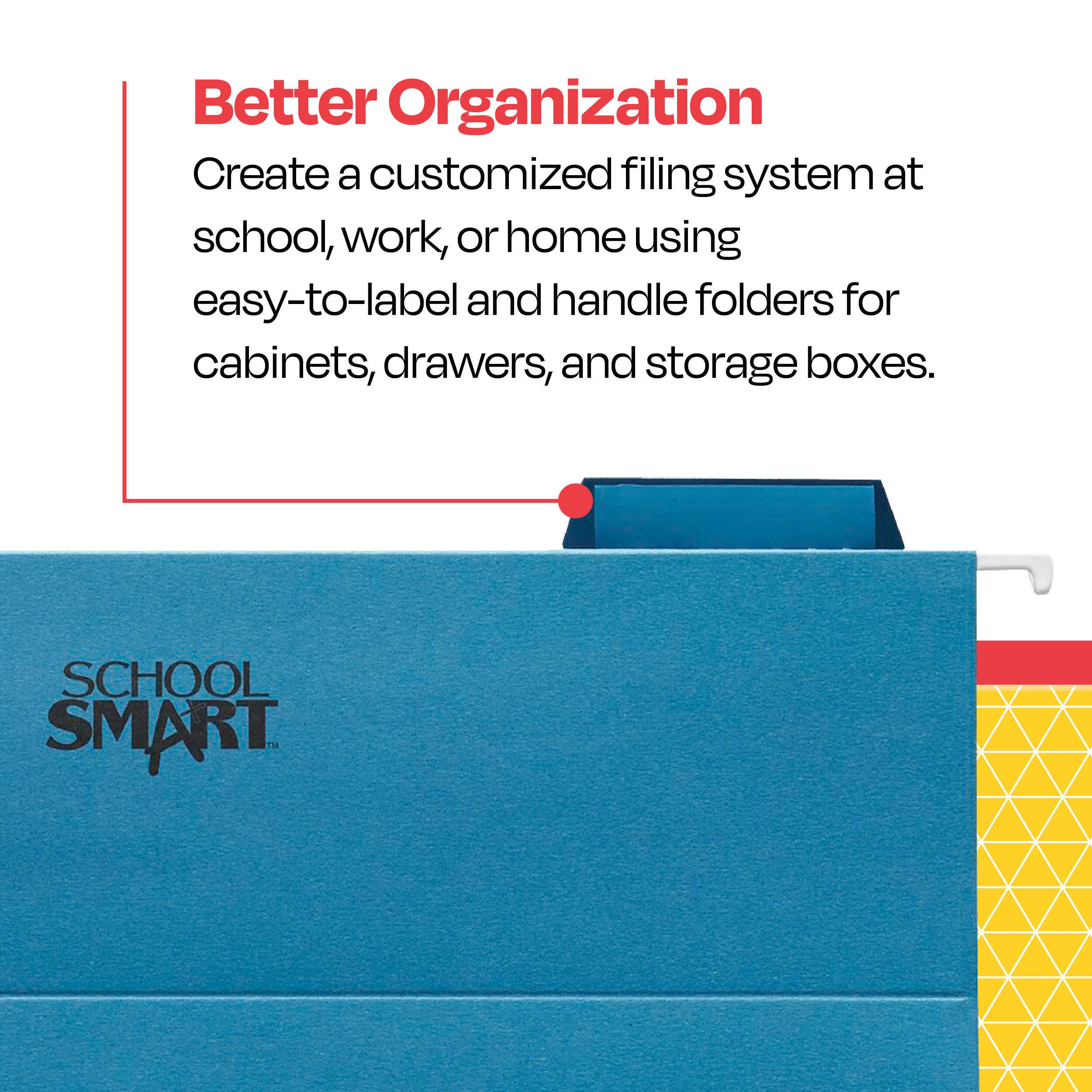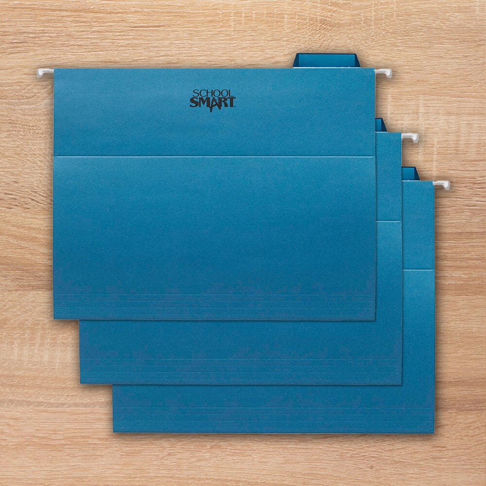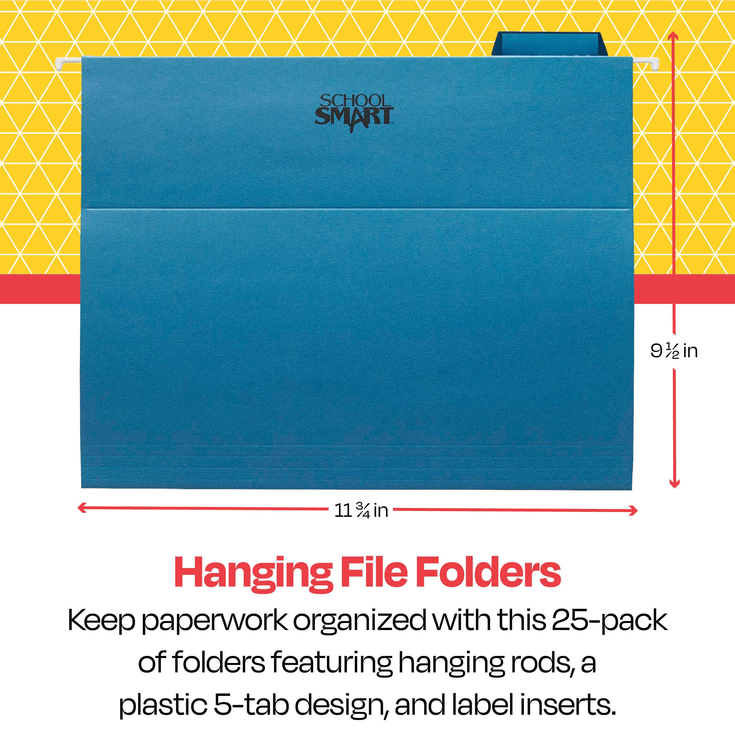 This School Smart hanging file folders letter size set has 5 clear top tabs. The blue folders are made of smooth, medium weight stock for long-lasting use in the classroom or office. A sturdy design helps store important paperwork in a vertical file, while the two tones help you identify files quickly and easily. Each reinforced hanging folder has coated hangers for smooth sliding in file cabinets, desk drawers, and storage boxes. Create custom labels with blank inserts and 1/5 cut clear tabs to create your best organization system for letter sized papers.