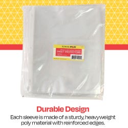 The School Smart Heavy Duty Sheet Protectors for 3-ring binders accommodate standard letter-size 8-1/2 x 11-inch sheets for versatile document storage. The clear finish allows you to see your documents while protecting them from tears, greasy fingerprints, and other wear. These binder sleeves fit perfectly in a three-ring binder, allowing you to organize and keep all your documents safe. Page protectors can also be used as a dry-erase sheet, perfect for classrooms, DIY transparency sheets, doctor offices, signage, and more. The protective document sleeves are designed with extra capacity to hold between 10-12 sheets of paper for additional project flexibility. This pack contains 100 clear sheet protectors.Features