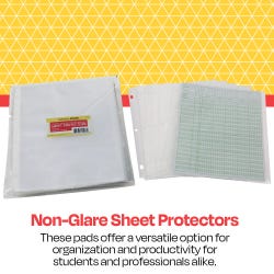The School Smart Heavy Duty Sheet Protectors for 3-ring binders accommodate standard letter-size 8-1/2 x 11 inch sheets for versatile document storage. The finish allows you to see your documents with no glare while protecting them from tears, greasy fingerprints, and other wear. The binder sleeves fit perfectly in a three-ring binder, allowing you to organize and keep all your documents safe. These versatile page protectors can also be used as a dry erase sheet, perfect for classrooms, DIY transparency sheets, doctor offices, signage, and more. They are designed with extra capacity to hold between 10-12 sheets of paper for additional project flexibility. This pack contains 100 non-glare sheet protectors.Features