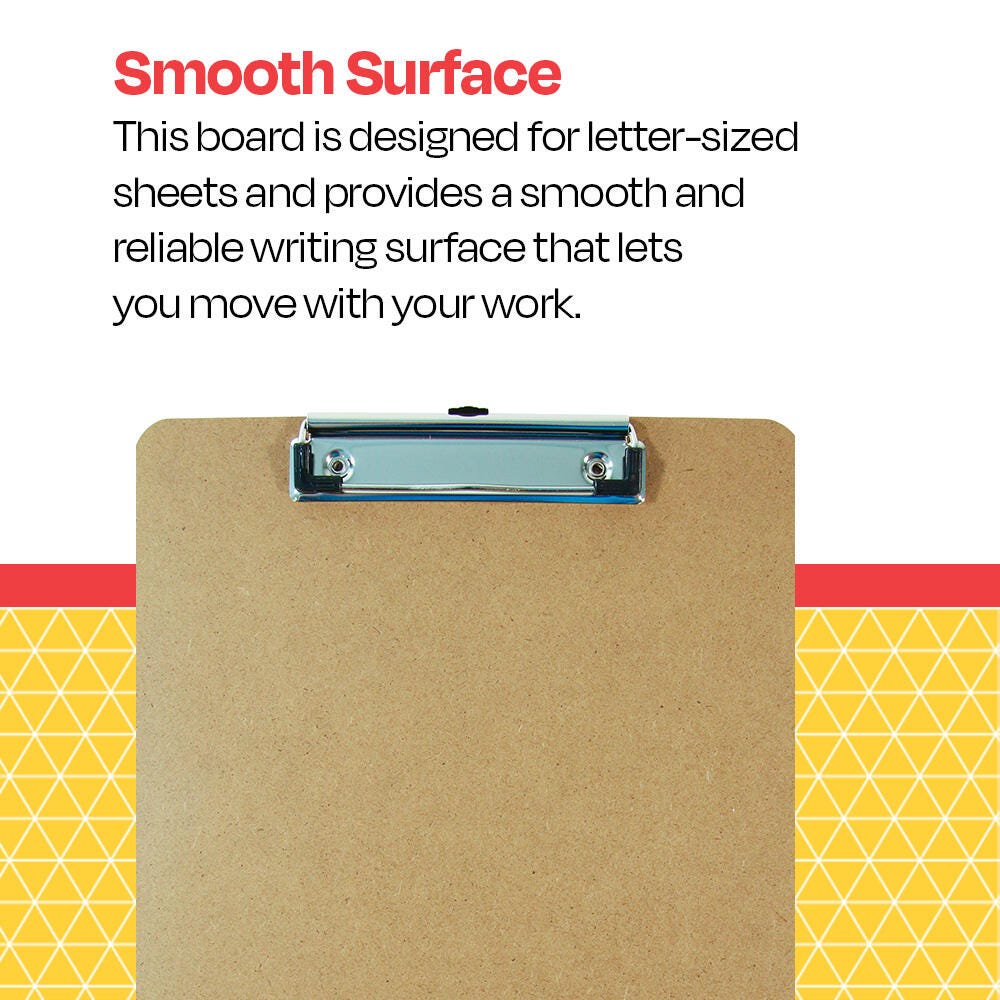 Take your work on the go with a reliable clipboard from School Smart. This practical Masonite clipboard measures 9 x 12-1/2 inches and is designed to be used with letter-size paper, perfect for standard work in the classroom or office. Each board has a low-profile metal clip that can hold up to 100 sheets of paper. The clipboard offers a smooth writing surface to keep your writing neat and legible while standing or moving.Features
