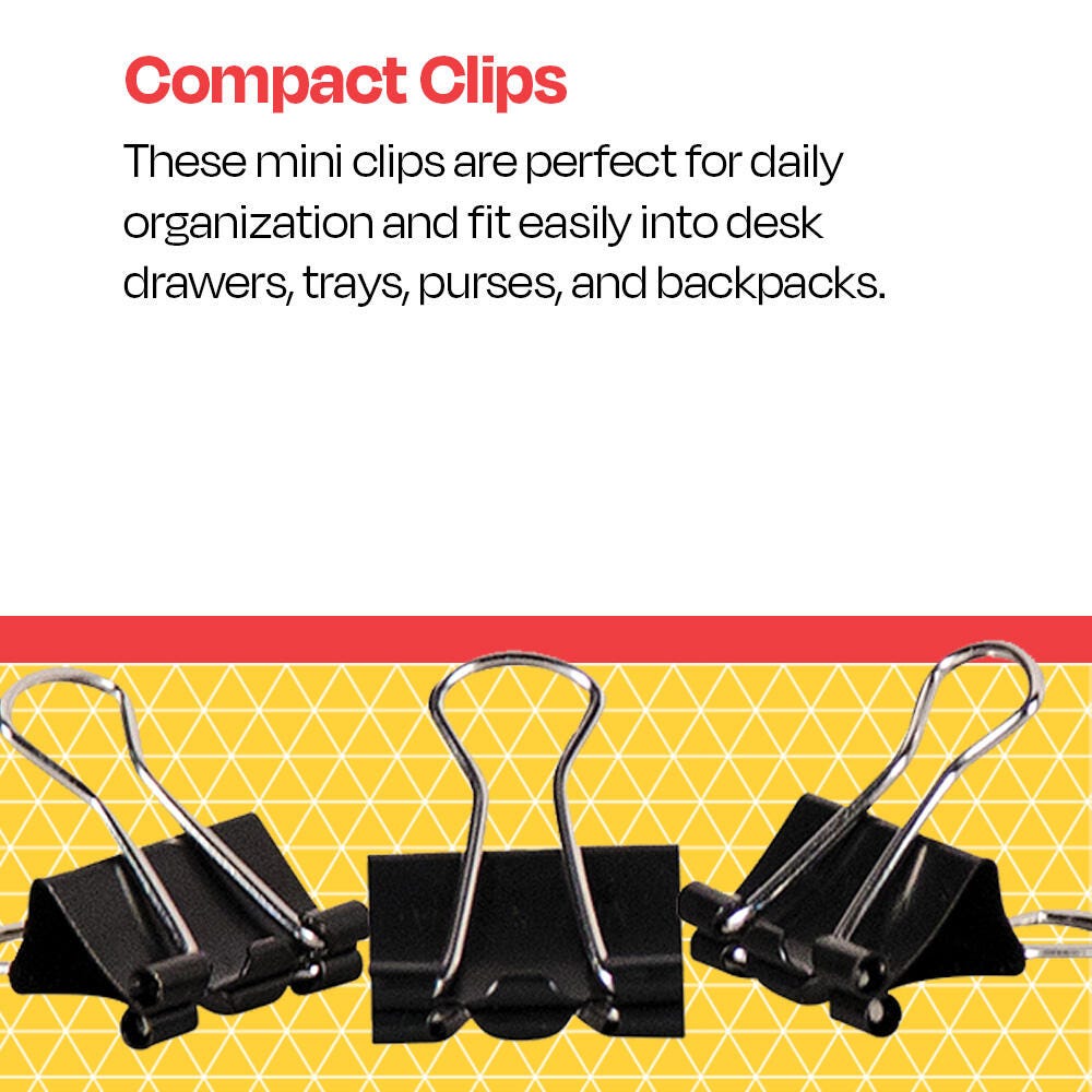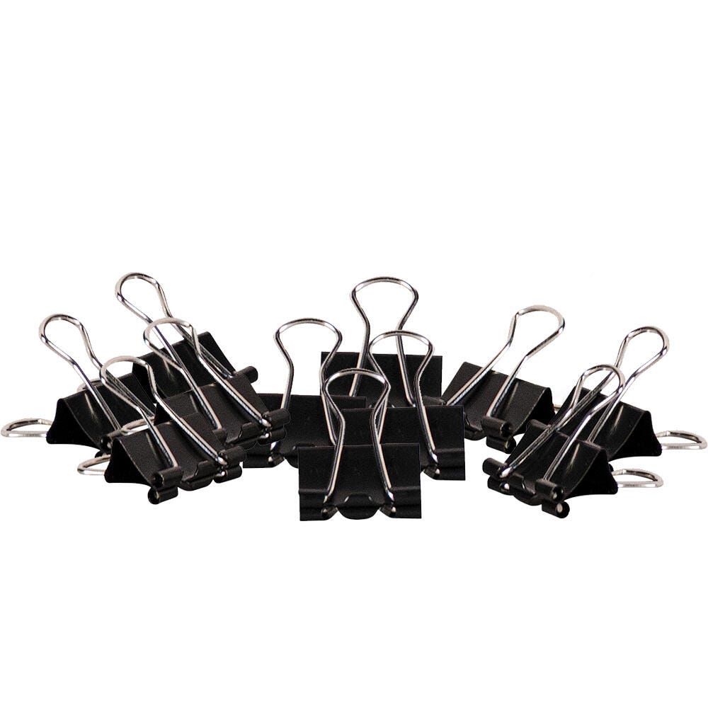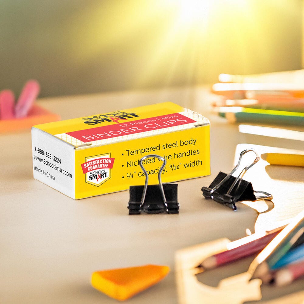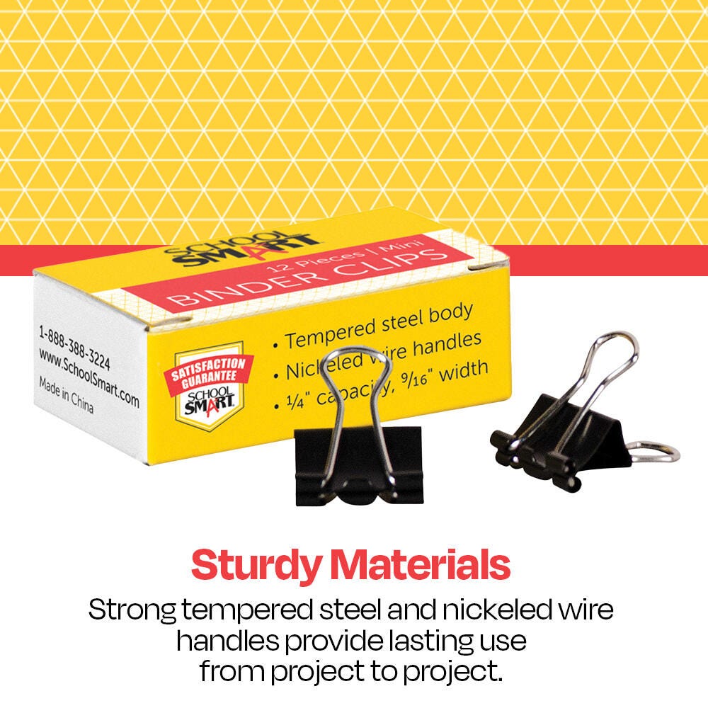 School Smart Mini Binder Clips are made of tempered steel and nickeled wire handles for durability. This 9/16 inch wide clip is versatile and ideal to keep your papers in an organized manner, sold as 12 per pack.