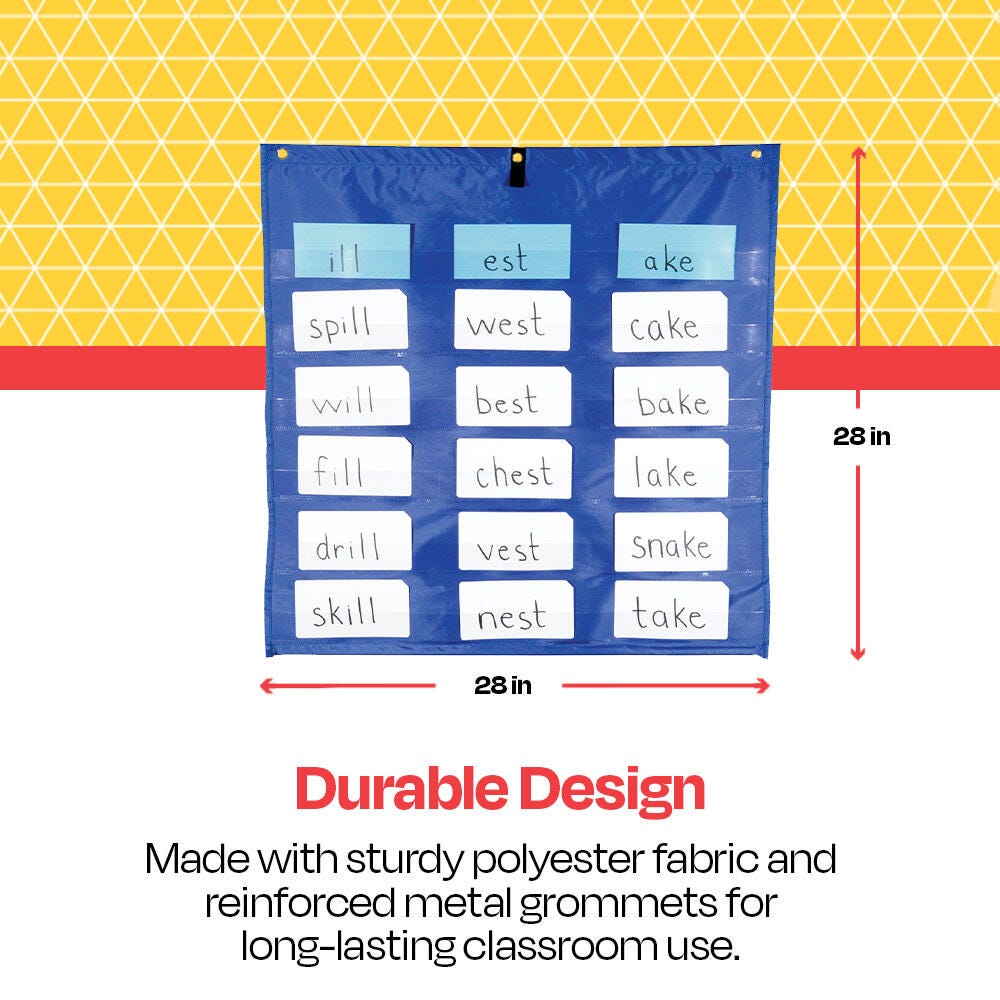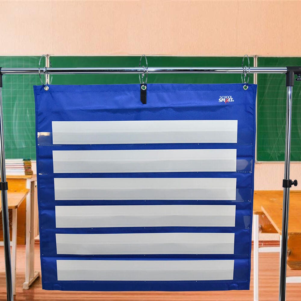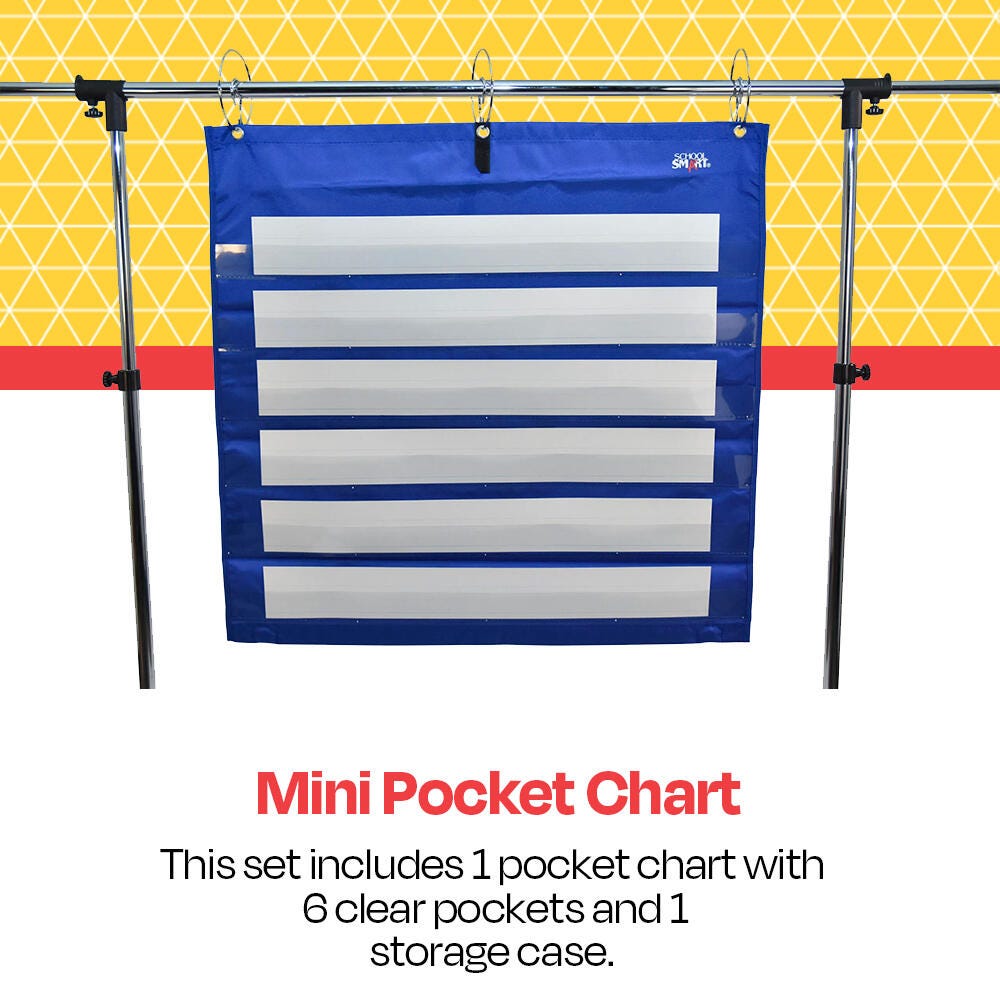 Teach concepts from phonics to math with this handy mini pocket chart by School Smart. The 28 L x 28 W inch design is equipped with a total of 6 horizontal pockets with clear/transparent slips. Use the long chart pockets to interchange flash cards, names, photos, and more for teaching and as a visual resource. Includes a storage case. Note: The stand, strips, and cards are not included with the hanging chart.