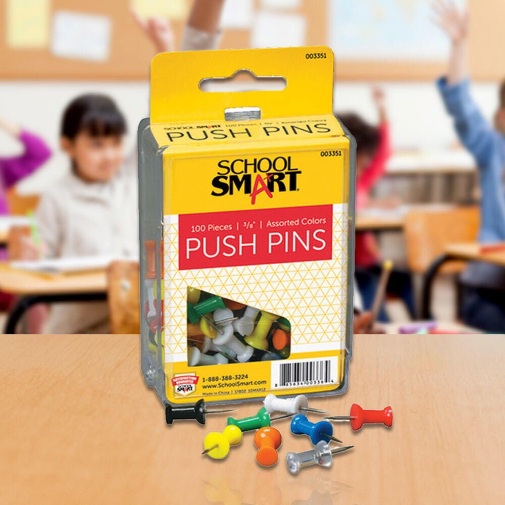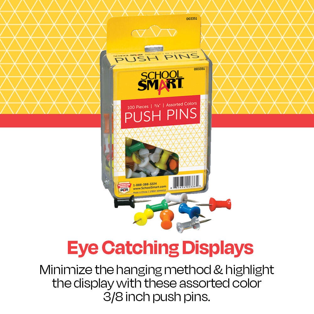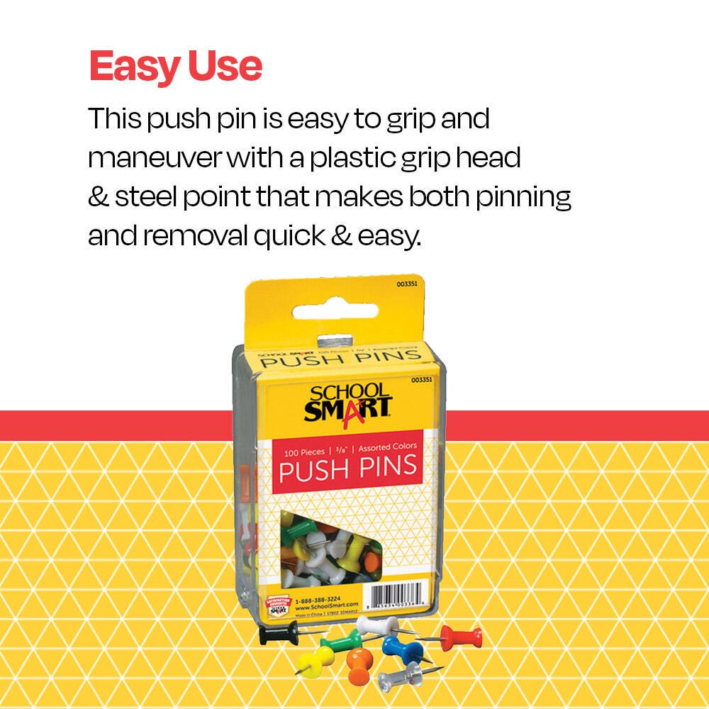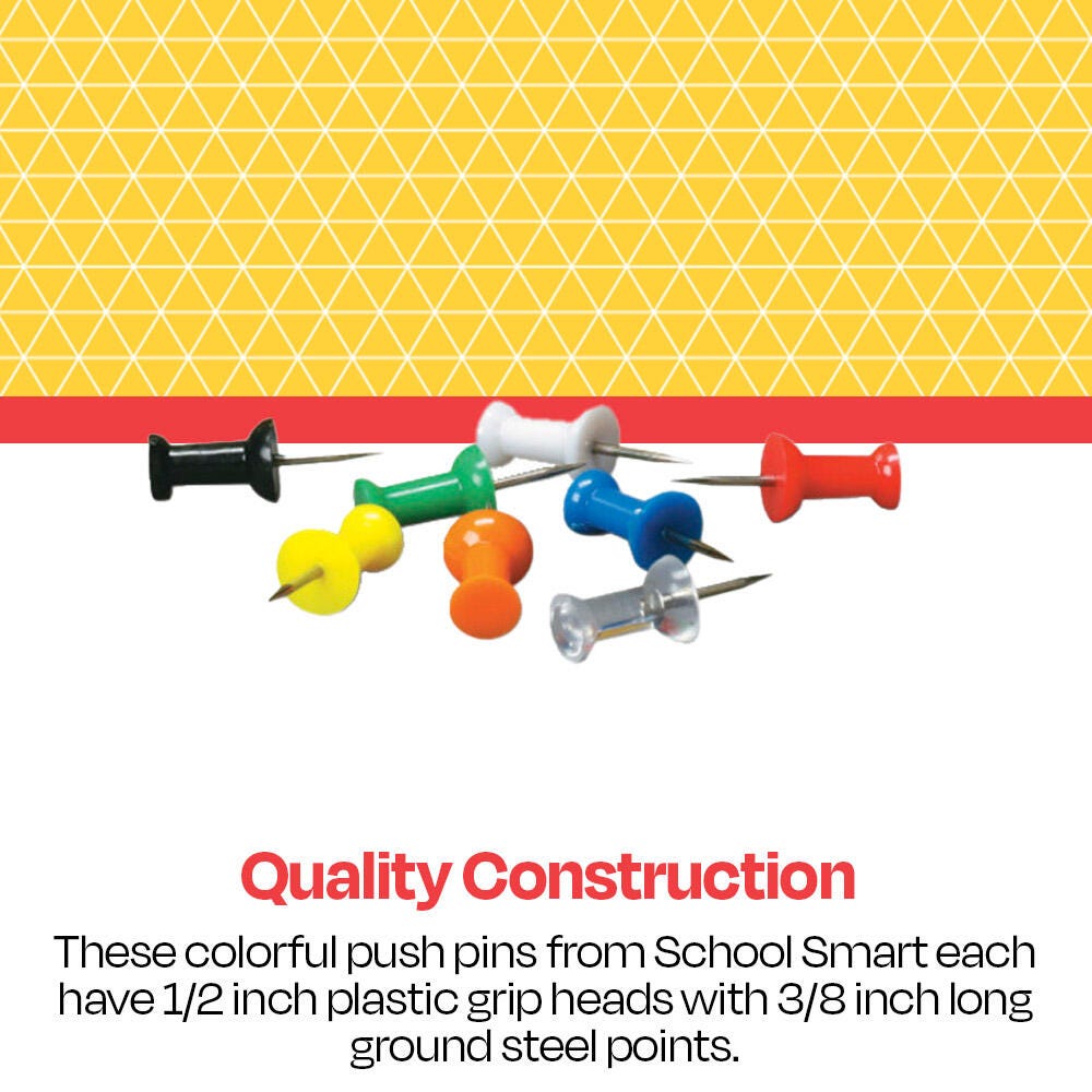 School Smart Push Pin featuring 1/2 in plastic grip heads with 3/8 in ground steel points is the ideal choice for bulletin boards. This push pin is easier to grip for pinning and removing from bulletin boards than the conventional thumb tacks, sold as 100 per pack in assorted colors.