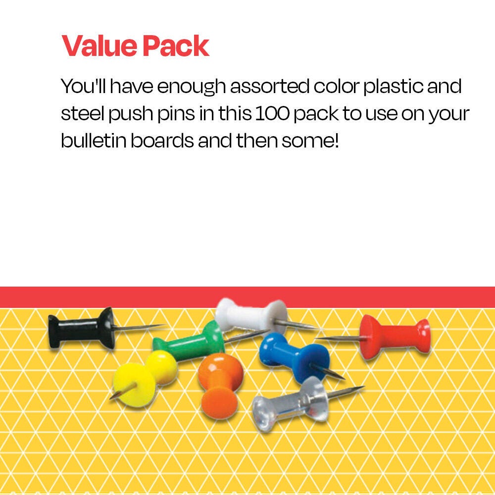 Keep class rules, motivational posters, and other important documents on your bulletin board display with our plastic push pins in assorted colors in a 100 pack.