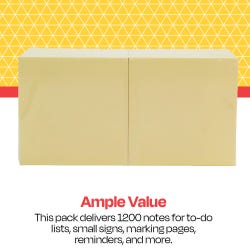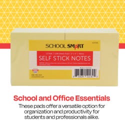 The School Smart Removable Self-Stick Notes provide a simple and economical way to leave reminders for friends, coworkers, roommates, or yourself! They have a strong, durable adhesive that sticks to most surfaces and can be removed and re-stuck, so your notes can move with you throughout the day. The 3 x 3-inch notes provide enough space for notes, reminders, and lists that stick right to your desktop, planner, or monitor. These notes are a helpful tool for all ages and settings! This pack contains 12 pads with 100 yellow sheets each.Features