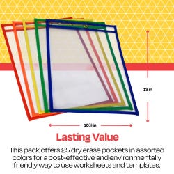 School Smart Reusable Dry Erase Pocket Sleeves, 10-1/2 x 13 Inches, Assorted, Set of 25