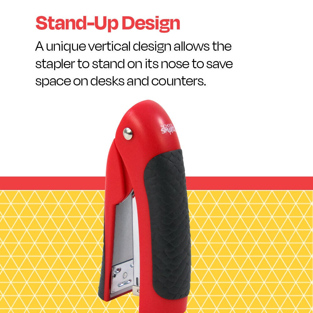 The School Smart Stand-Up Stapler is a great solution for teachers or professionals with small desks or workspaces. Its ergonomic stand-up design allows the stapler to be stored on its nose, taking up less desk space than conventional desktop staplers. The stapler has a soft foam grip to improve comfort during repetitive stapling tasks and fastens up to 20 sheets of paper to handle most projects in the classroom or office. The convenient rotating anvil allows both stapling and pinning. This stapler has an eye-catching red color and uses standard staples.