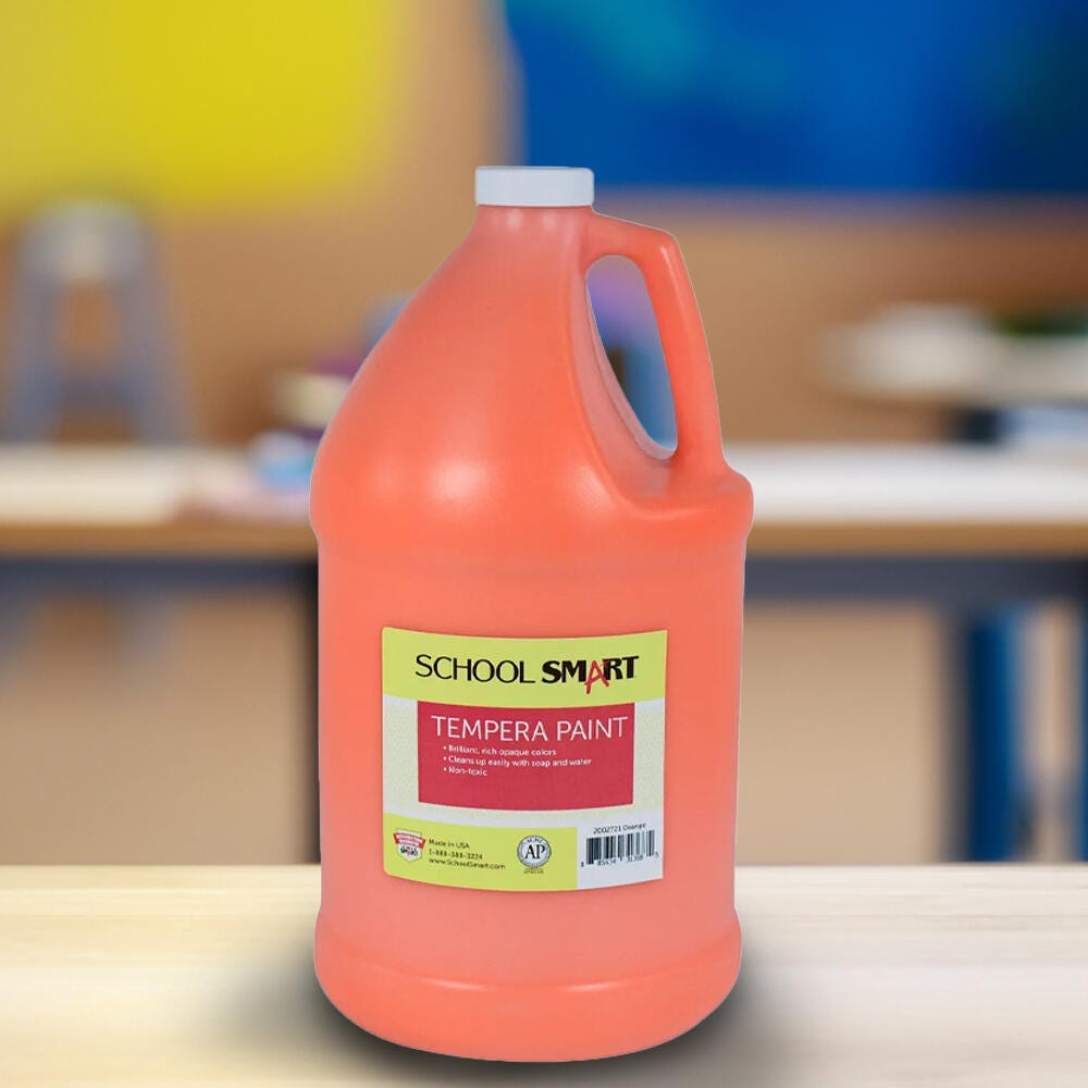 The School Smart traditional tempera paint gallon comes in an orange color. This paint is an economical value size bottle for classrooms and childcare centers. Our brilliant and rich opaque paint color offers students endless creativity and color blending possibilities. The non-toxic tempera paint cleans up easily with soap and water and won’t chip, flake, or crack when dry. This large bottle of orange tempera paint is great for classrooms, schools, art classes, and after school programs.