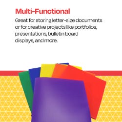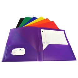 Compile and file with ease with School Smart 2-pocket poly folders with no brads or fasteners. The assorted color plain plastic folders keep letter-size papers straight, neat, and accessible. Flexible and lightweight (yet built to last), each portfolio is made of durable polypropylene that resists moisture and dirt. The left interior pocket includes a business card slot for labeling or presentations. Use the 2-pocket heavy duty poly portfolio for business or personal use to organize documents, assignments, presentations, and notes.Features