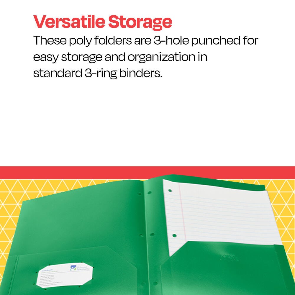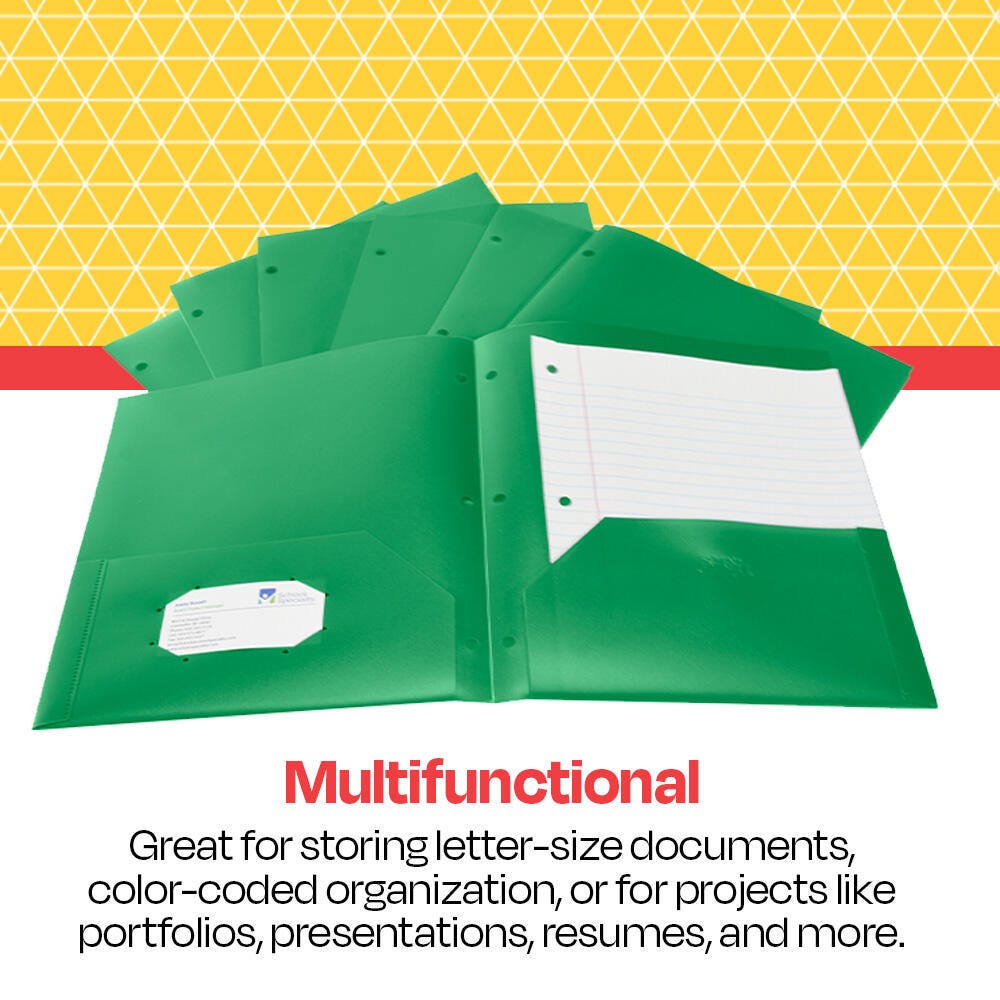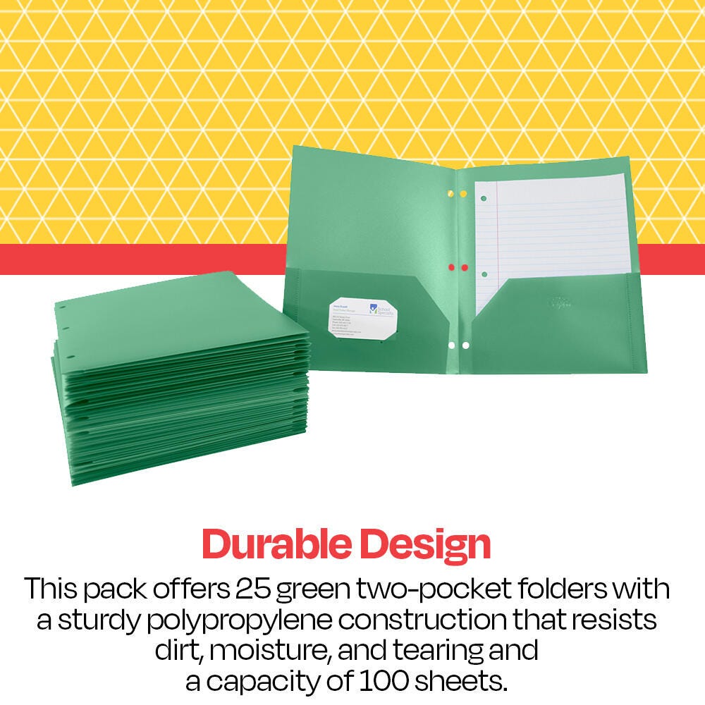This pack of School Smart's 2-Pocket Folders is an excellent choice for stocking your classroom or office for reliable organization and document storage. These folders are made of a flexible, lightweight, and durable polypropylene material that resists moisture and dirt to keep your papers protected during storage and transport. Each folder has a left interior pocket with a business card slot, and is 3-hole punched to fit standard three-ring binders to provide even more organization options. They are designed to hold letter-size, 8-1/2 x 11-inch sheets for simple daily use. This pack contains 25 green folders.
