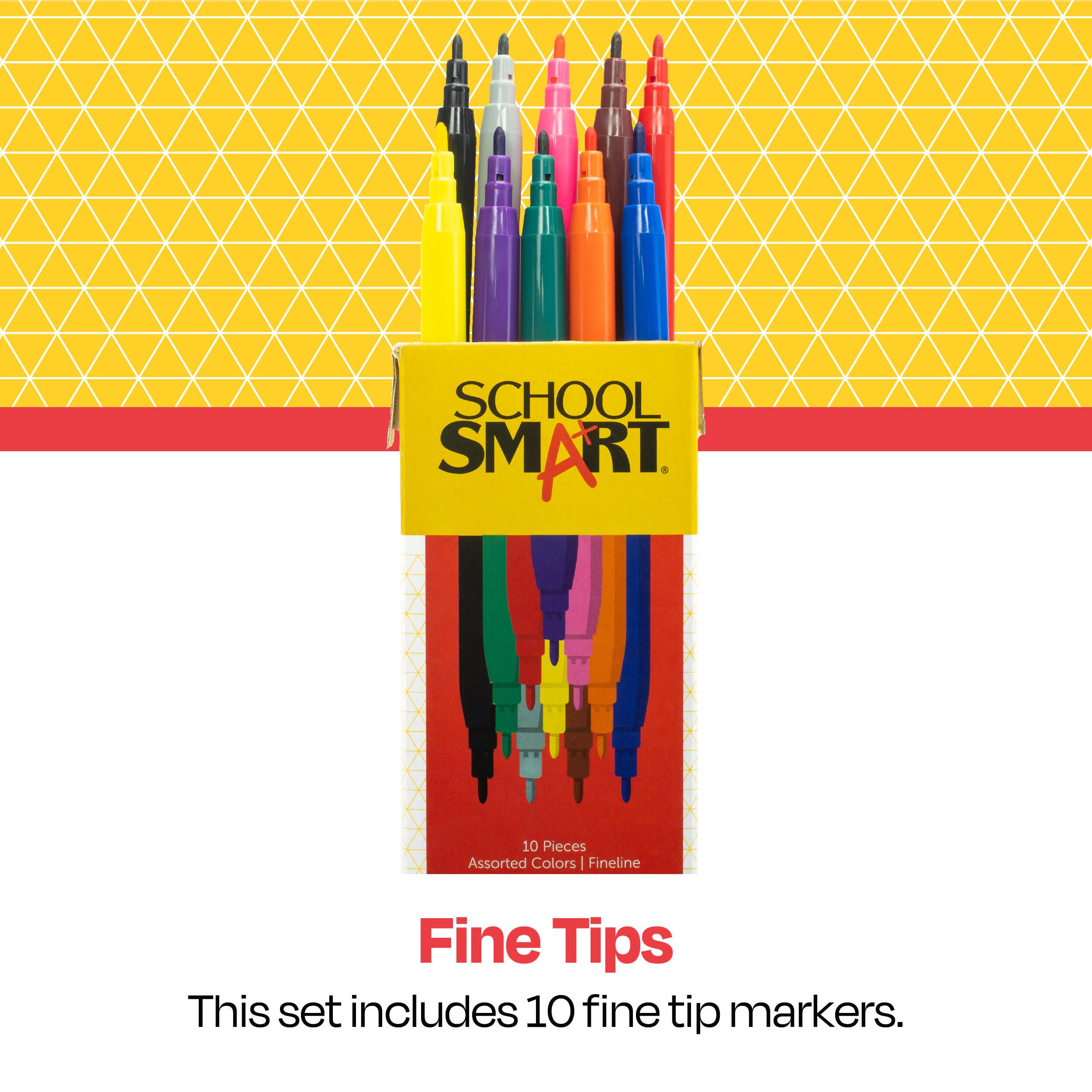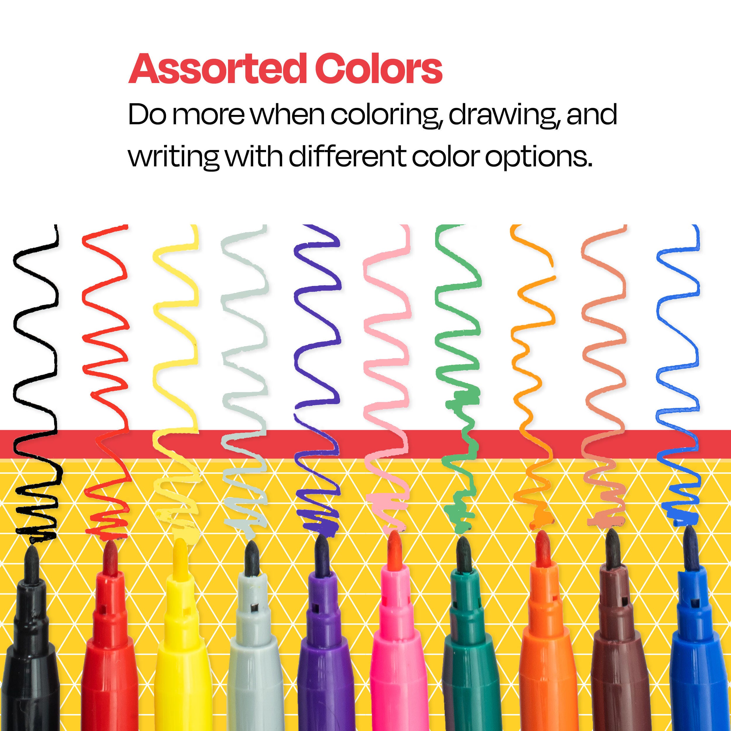Color with better detail using School Smart washable markers with fine tips. Our fine line markers offer high-quality, vivid colors. Each narrow tip marker measures 5-1/4 inches and helps create thin lines when you need them. Whether it’s a creative drawing or a school project, we’ve got you covered. Our washable fine-tipped markers have long-lasting tips that hold up for everyday home and school use. This non-toxic coloring set for classrooms includes 10 assorted colors: black, red, blue, green, yellow, orange, brown, violet, gray, and pink.