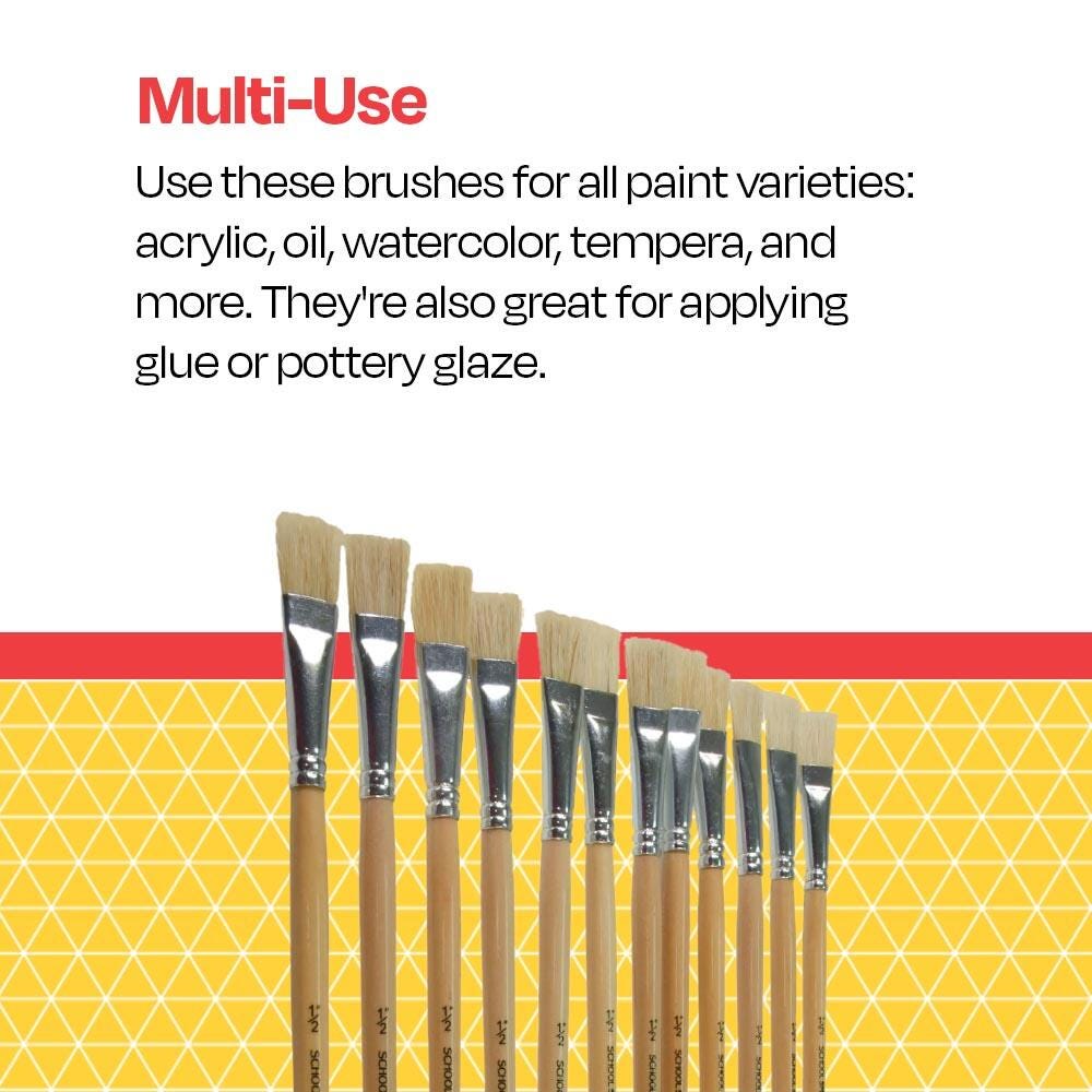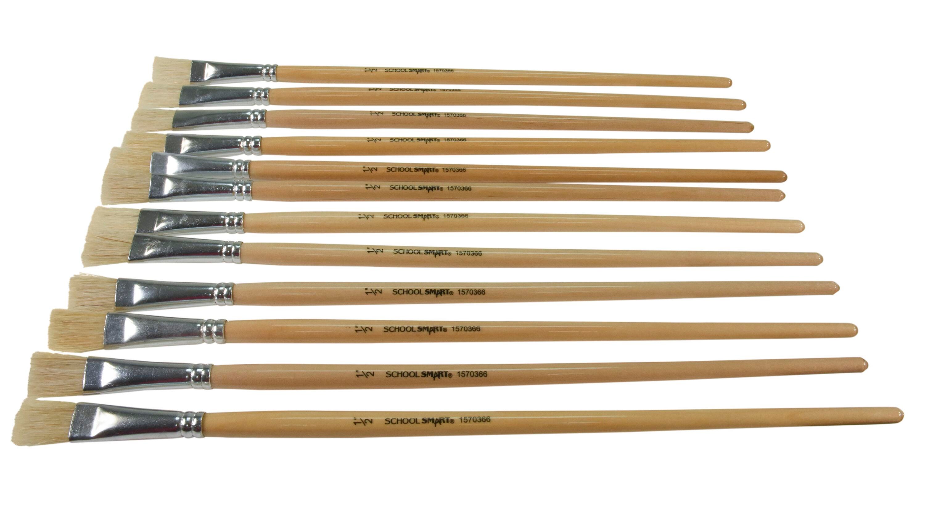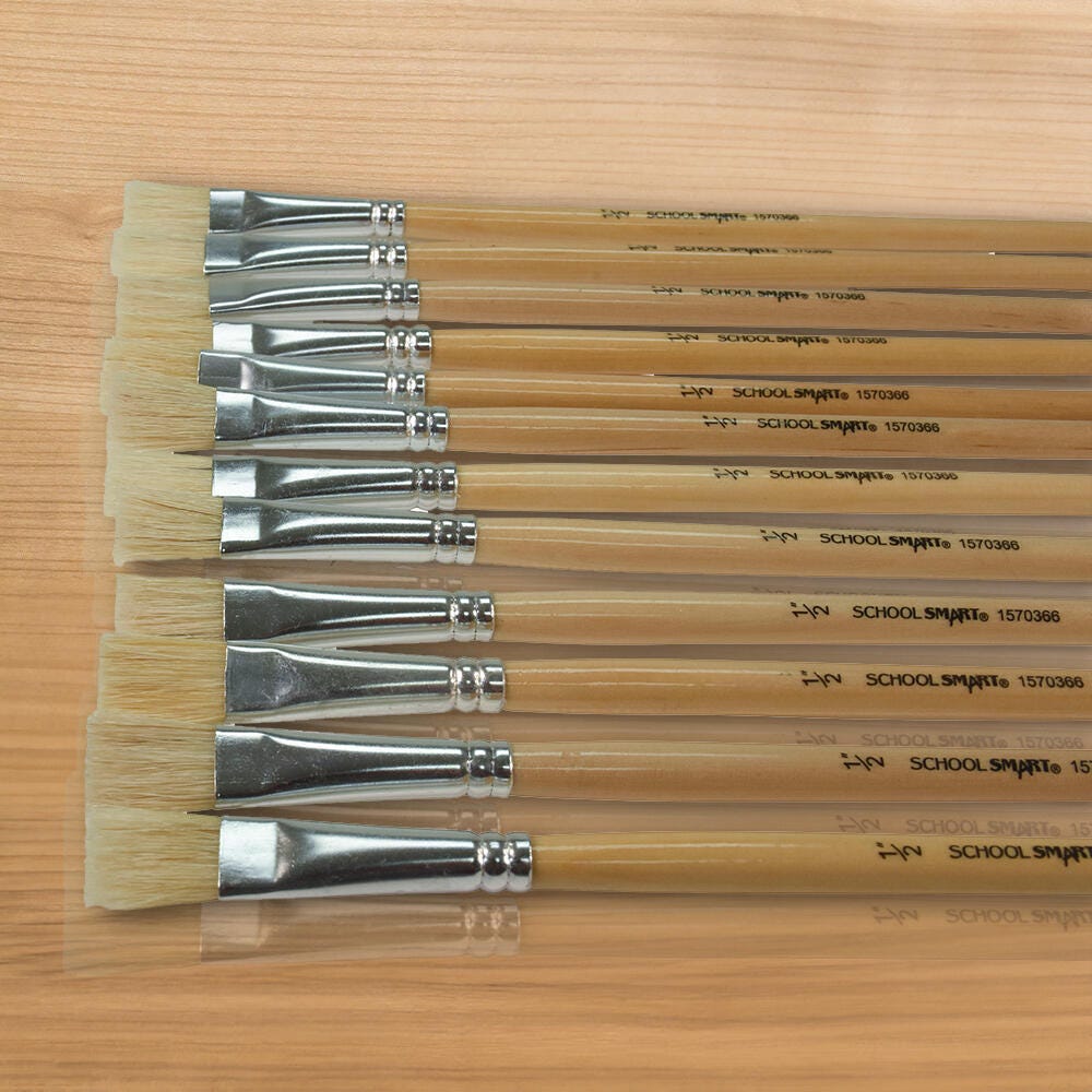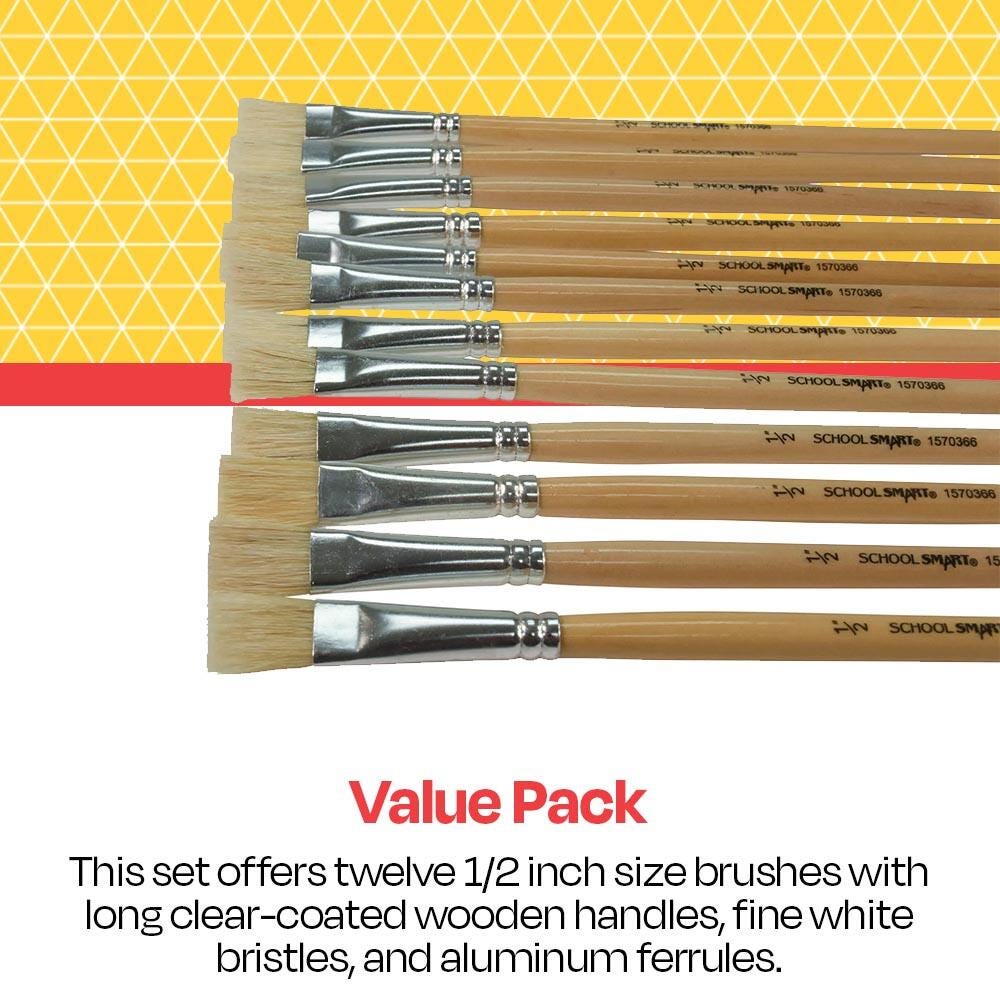 Ideal for many types of mediums, the School Smart white bristle, flat paint brush set has 12 traditional wooden brushes in a 1/2-inch size. The long-handled paint brushes have interlocked bristles in seamless, smooth aluminum ferrules. Each hardwood handle is clear-coated and easy to use and hold. Perfect for schools, classrooms, and recreation centers, our affordable art tools help you stock up and save.