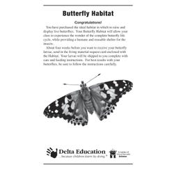 - 1 Delta Education Butterfly Habitat measuring 2 feet tall when expanded with a 15-inch diameter. Includes a Living Material Card Code that can be redeemed for 5 larvae plus a teacher's guide. Butterfly habitat features a pop-up cage with clear plastic top and a see-through netting that enables the students to see the life cycle of a butterfly through all stages