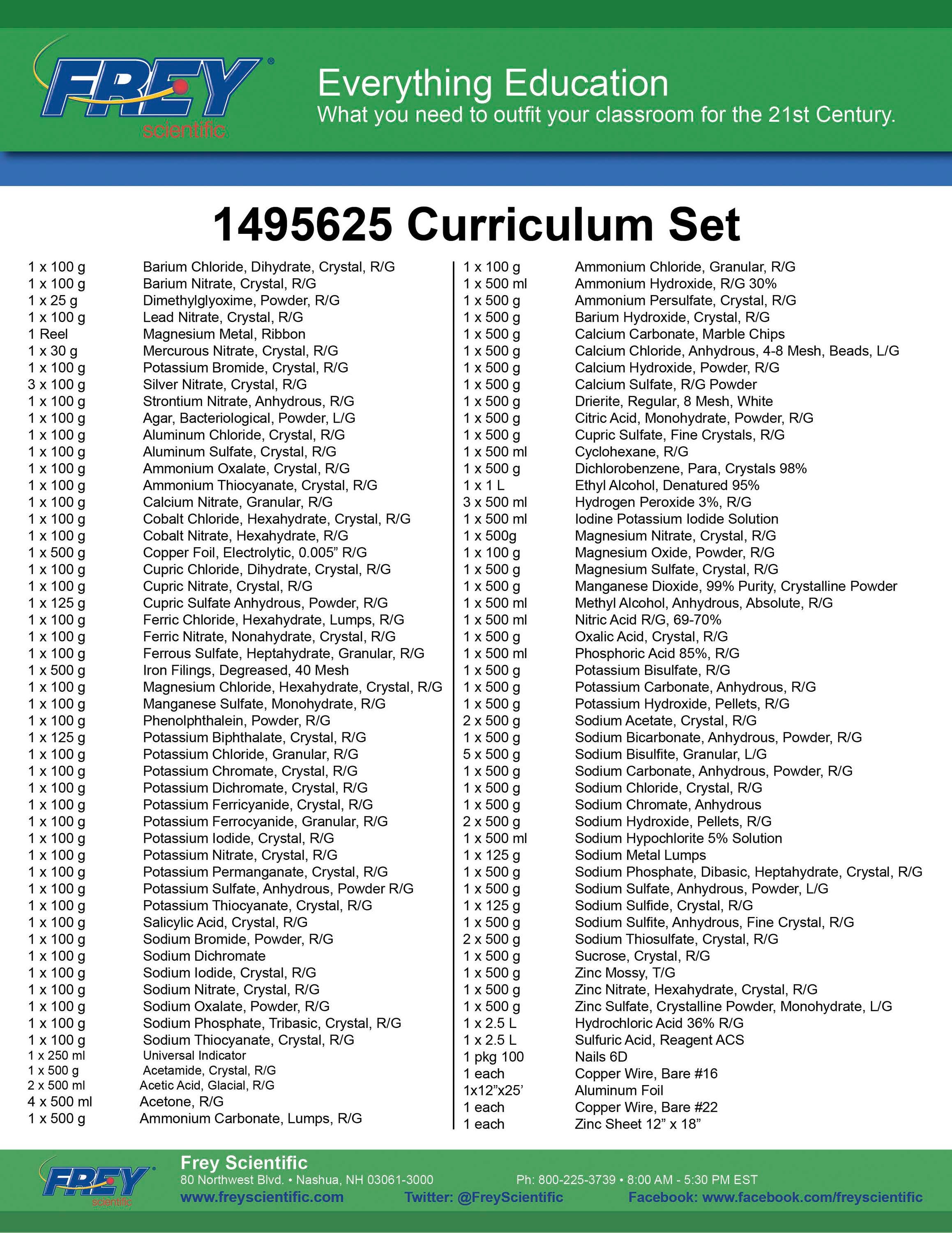 Frey Scientific Comprehensive Chemical Set includes more than 100 different chemicals and is ideal for most high school general chemistry laboratory courses. It can be used as an inventory checklist to a keep track of your current stock of chemicals. Set is cost-effective and offers a substantial savings from the total of individual prices.- 1 x 100 g Barium Chloride, Dihydrate, Crystal, R/G UN1564