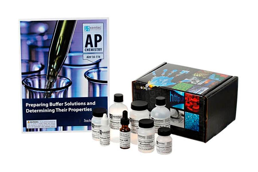Kemtec Preparing Buffer Solutions and Determining Their Properties Kit allows students differentiate the pH changes of their buffer to those of distilled water and other solutions while less preparation time is required. After being designated one of the three buffer systems, pH, component acids, bases or conjugates students build a buffer and test it based on their own calculations while they make use of Henderson-Hasselbach equation in analyzing buffers. *AP and Advanced Placement are trademarks registered and/or owned by the College Board, which was not involved in the production of, and does not endorse, this product.Features