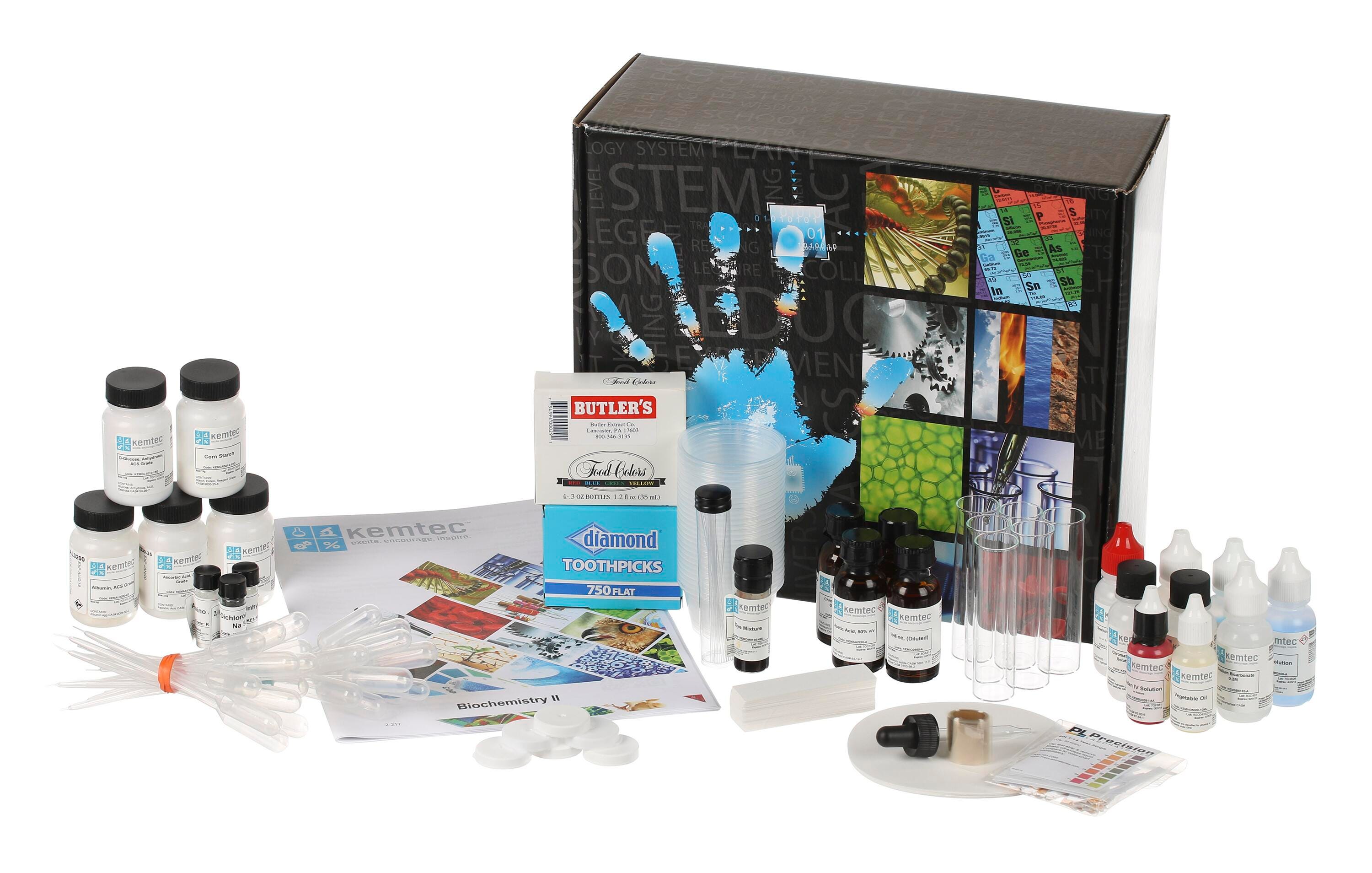 Biochemistry II includes an entire course worth of classic biochemistry experiments presented at a more in-depth level than Kemtec's Biochemistry I. The kit introduces students to biochemistry techniques expanding across ten distinct topics. Includes: Determining the pH of Foods, Saliva, and Soil; Starch Determination, Sugar Determination, Fat Determination, Protein Determination, Amino Acid Determination, Pepsin Digestion of Protein, Amino Acid Detection using Ninhydrin, Effects of Varying Conditions on Salivary Amylase Activity, Modeling How Digestion Works, Determination of Ascorbic Acid Concentration, and Paper Chromatography of Various Dyes and Plant Pigments Using Different Solvents. Ideal for supporting higher level biology, nutrition, advanced general science, or biochemistry courses. Allow 8 - 10 hours of lab time. Designed for 24 students working in groups of four. Required, but not included: a hot plate or water bath, 50mL beakers, forceps, storage jars with caps, funnels, and food samples for testing.Instructor's manual, chromatography vials, Chromatography solvent solutions A, B, and C, chromatography paper, dialysis tubing, Benedict's solution, Biret solution, Hydrochloric acid, Sodium hydroxide, Starch, Glucose, Albumin, Pepsin, Ascorbic acid, Iodine solution, Sudan IV solution, Sodium bicarbonate solution, Acetone, Vegetable oil, Ninhydrin, 2, 6 Dichloroindophenol, Dye mixture, Amino acid mixture, pH paper, filter paper, plastic transfer pipets, and plastic loading pipets.